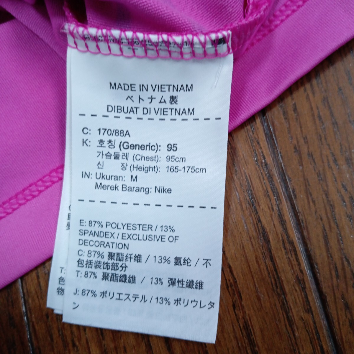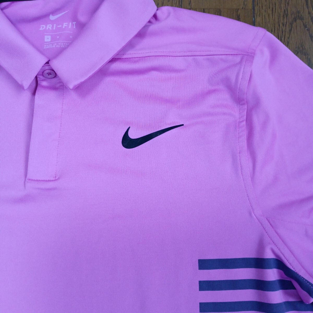 色はベリーピンク、半袖 ポロシャツのご紹介です。フロントボタン部分が特徴でボタンは1つ、写真2番がよく見えると思います。左胸に大き目の『NIKE』のロゴプリント、脇から裾にかけて紺のボーダー柄が入っています。DRI-FITです。