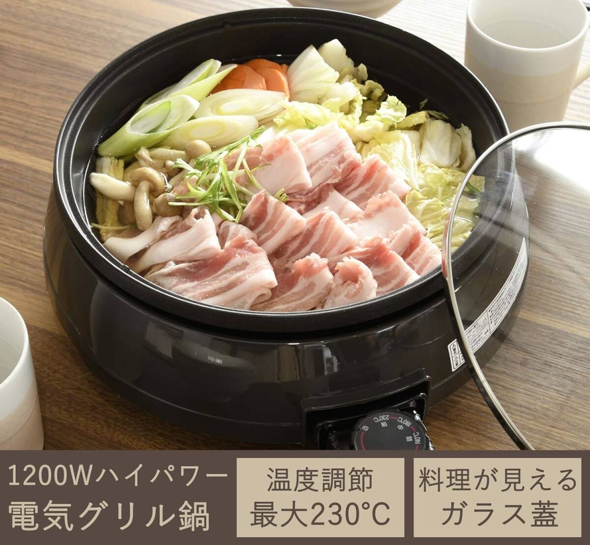 ●完全着脱・水洗い可能・ガラス蓋付き グリル鍋 1200W  容量:約2L(直径23 深さ5cm)