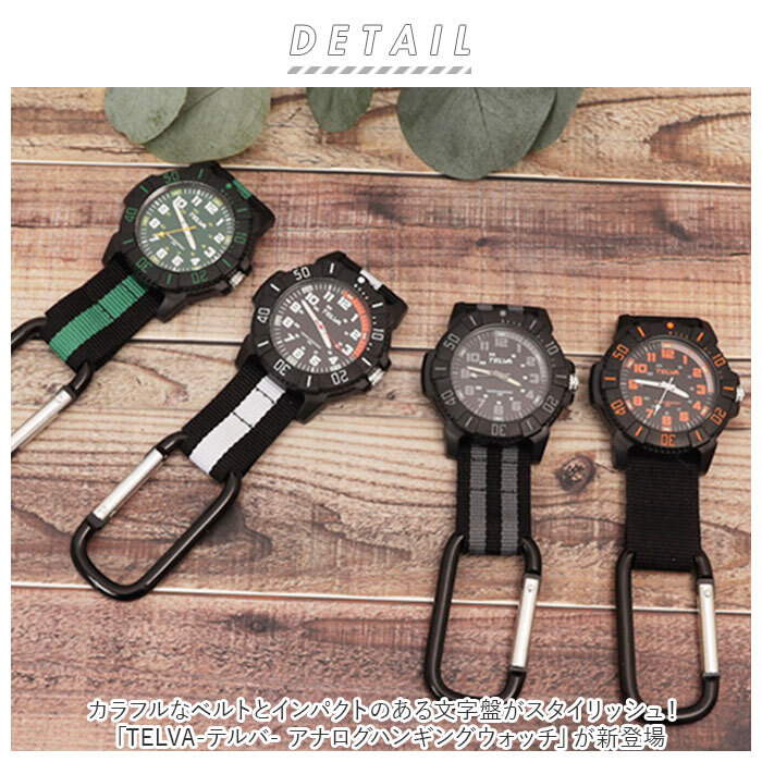 | 商品説明 | ・・カラフルなベルトとインパクトのある文字盤がスタイリッシュ!「TELVA-テルバ- アナログハンギングウォッチ」が新登場。 ・ベルトに付いたカラビナフックで、パンツのベルト通しやリュックのループなどに引っ掛けて使えるワイルドなハンギングウォッチ。 ・アウトドアでも時間が読みやすい、視認性の高い数字フォント(字体)でレイアウトされた、レトロなアナログウォッチフェイス。 ・長針・短針・秒針と、2時間ごとの目盛りには蓄光塗料が使用。夜間でも時間が確認しやすく、アウトドアで夕闇に包まれても安心。 ・文字盤のフレームには、経過時間の計測に便利な回転ベゼル付き。 ・水周りでのお仕事や手洗いのとき、屋外で突然雨に降られても安心して使うことのできる日常生活用防水機能付き(5気圧防水)。(※完全防水仕様ではありません。) ・ユニークなハンギングスタイルなので、医療現場で働く方や腕時計をつけられないお仕事の方、腕時計の金属部分が肌に直接触れるのが心配・・・という敏感肌の方にもピッタリ。 ・シンプルなカラーリングとスポーティなルックスが、カジュアルファッションやアウトドアスタイルとの相性抜群。 |