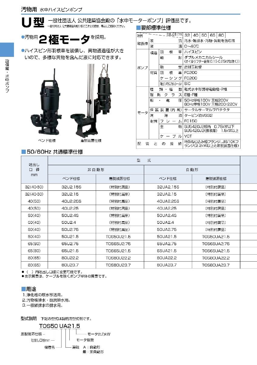 鶴見製作所 ツルミポンプ 50U21.5 50Hz 東日本用 雑排水用 水中ハイスピンポンプ U型 非自動形 口径50mm 三相200V 出力1.5kW 水中ポンプ ※こちらの商品は、「代金引換」支払を ご利用いただけません。