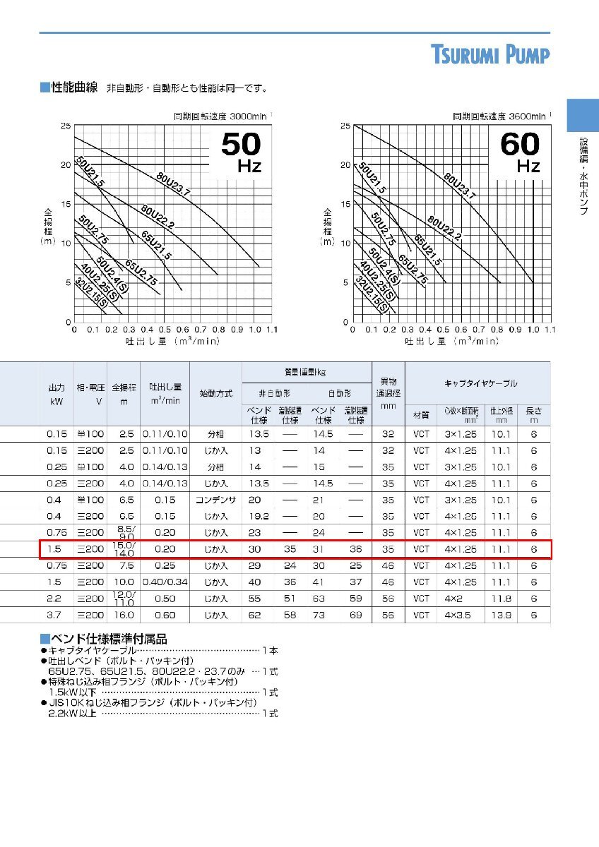 〈ツルミ〉50U21.5 50Hz 東日本用 雑排水用 水中ハイスピンポンプ U型 非自動形 口径50mm 三相200V 出力1.5kW ツルミポンプ 代引不可