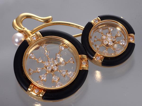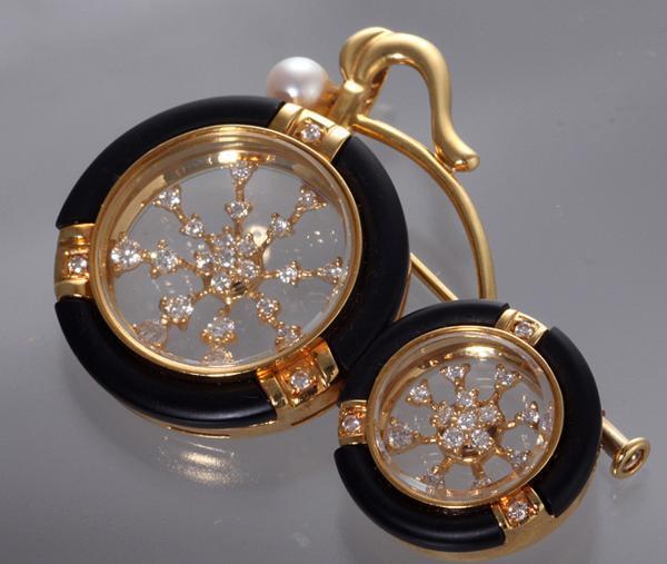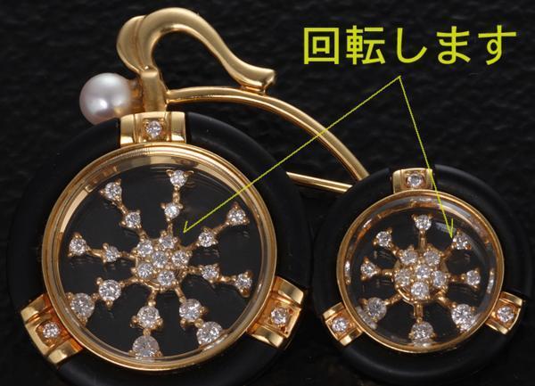 コメント | [[全ての商品に品質保証カードが付きますのでご安心ください]] なんとお洒落なデザインでしょうか。 タイトルにも最初自転車と記したのですが、見直したら不細工でしたので、Bike に変更しました。 写真の表裏にはガラス風防が入っています。ベアリングだけではなく、もしかしたら磁気を利用しているかも知れません。かなり小さな揺れで綺麗に車輪が動きます。 ダイアが合計で0.52カラットです。 ブローチだけでなく、バチカンも付いていますので、ペンダントトップとしても使用できます。こういった商品に詳しい鑑定士が想定した上代価格は100万円とのことでした。 |