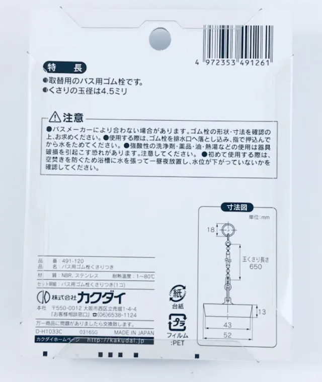 カクダイ バス用ゴム栓 くさり付 排水口径 51mm 491-120 風呂せん