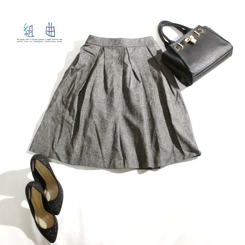 美品 組曲 クミキョク 株) オンワード樫山 秋 冬 大人可愛い カシミヤ混 ラメ ウールスカート 1 ホワイト 白 ブラック 黒 綺麗め フォーマ