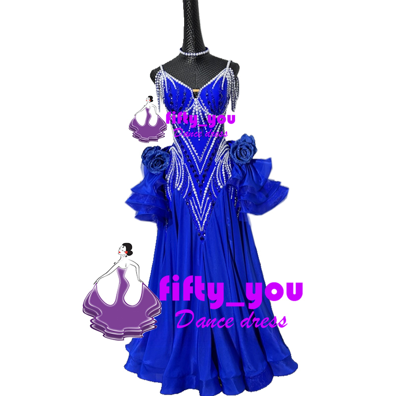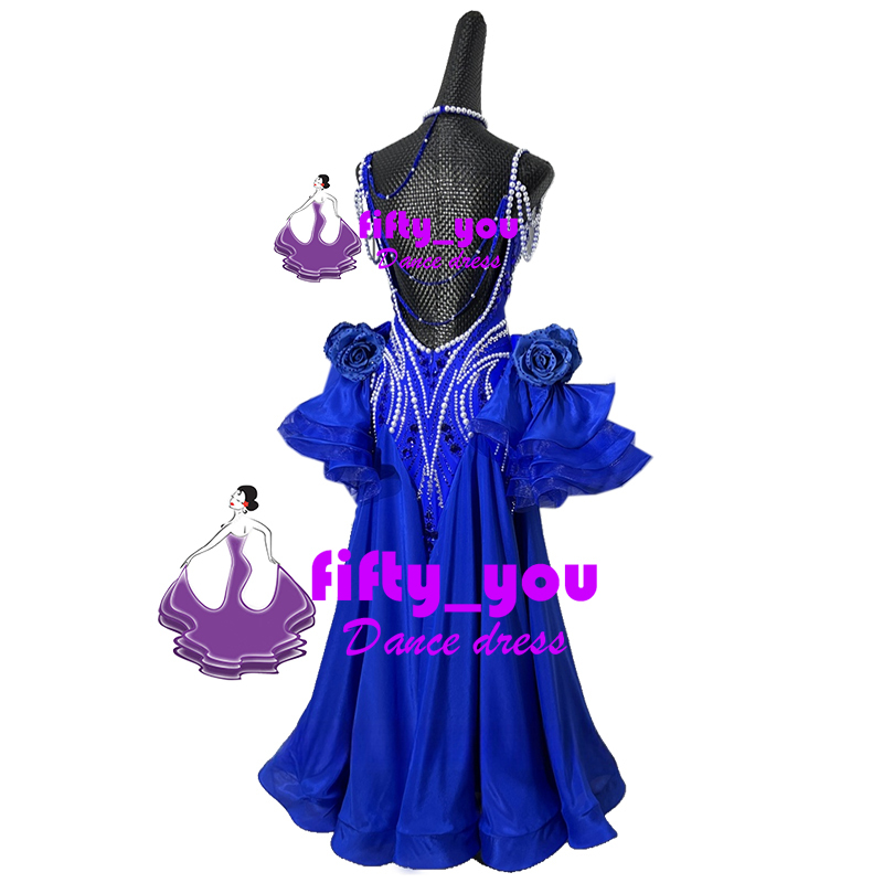 新品fifty_youレディース社交ダンス衣装 サイズセミオーダー  スタンダードドレス  競技高品質ドレス ローヤルブルー 花付きフロート