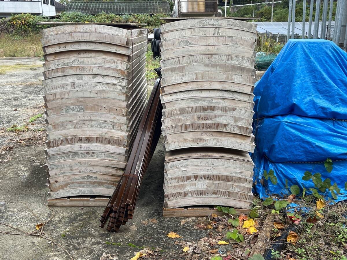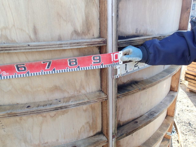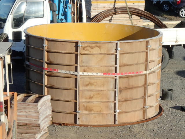 円形合板型枠φ3,000用です(余裕長に御注意ください)。1リフト1,800で横桟式で鋼管を立ててアングルバンドで締めます。