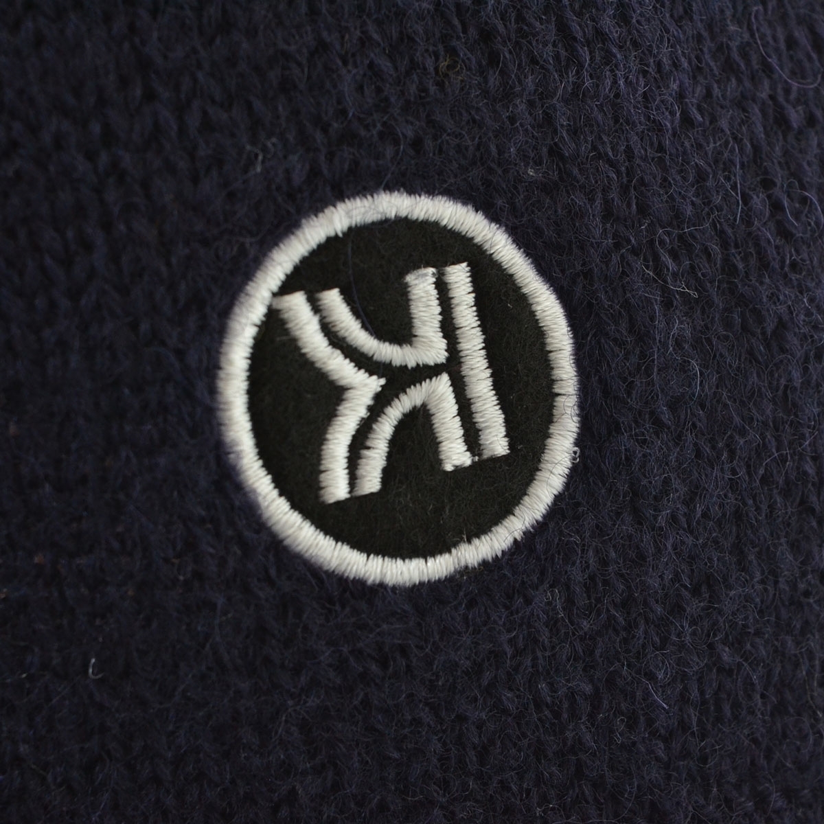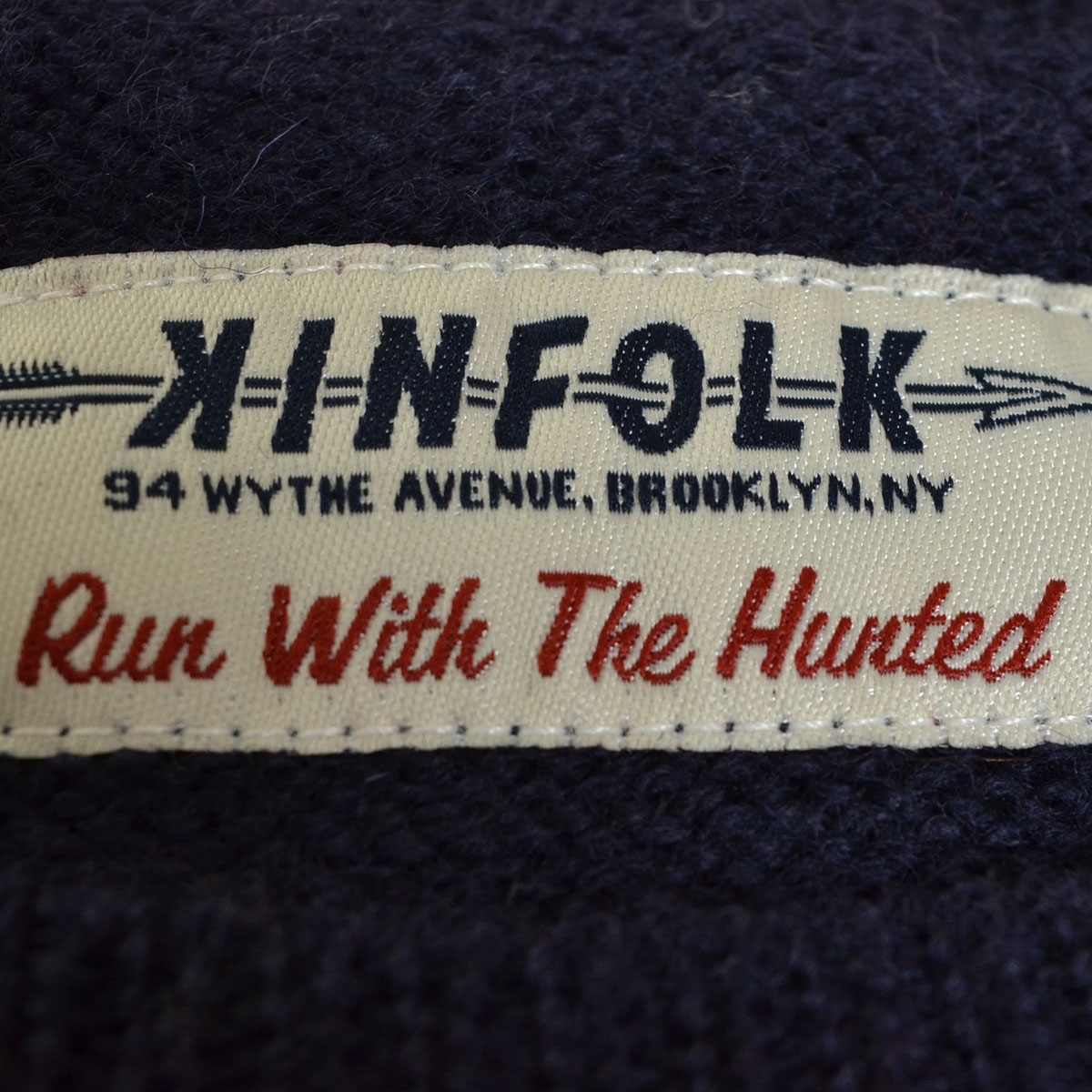 〇416012 KINFOLK キンフォーク ○リブニットセーター ロゴ刺繍 丸首 BEAMS取扱 サイズ2 ウール100% 裾ドロスト メンズ ネイビー