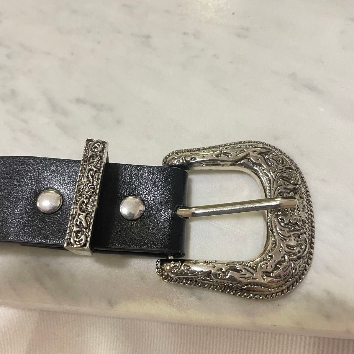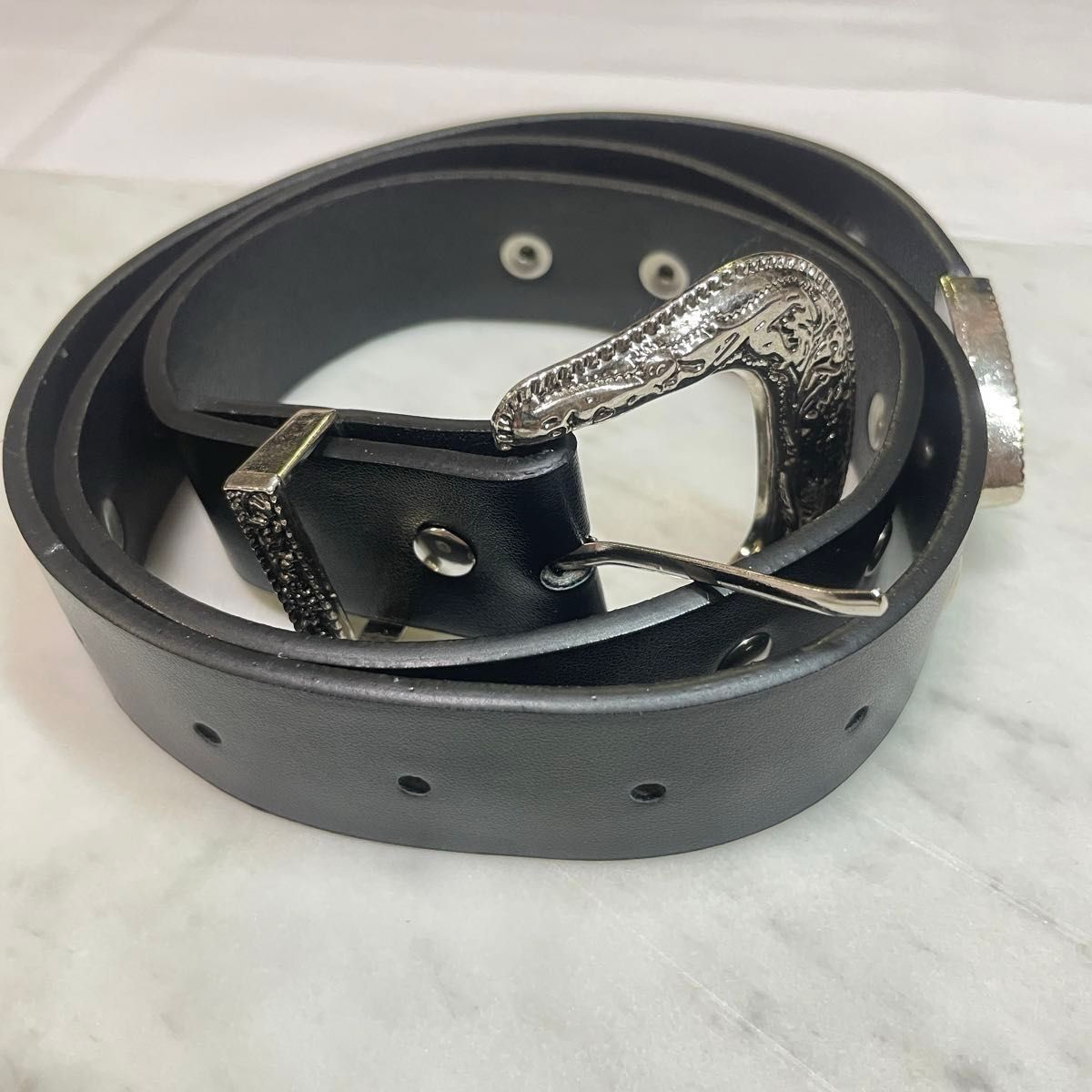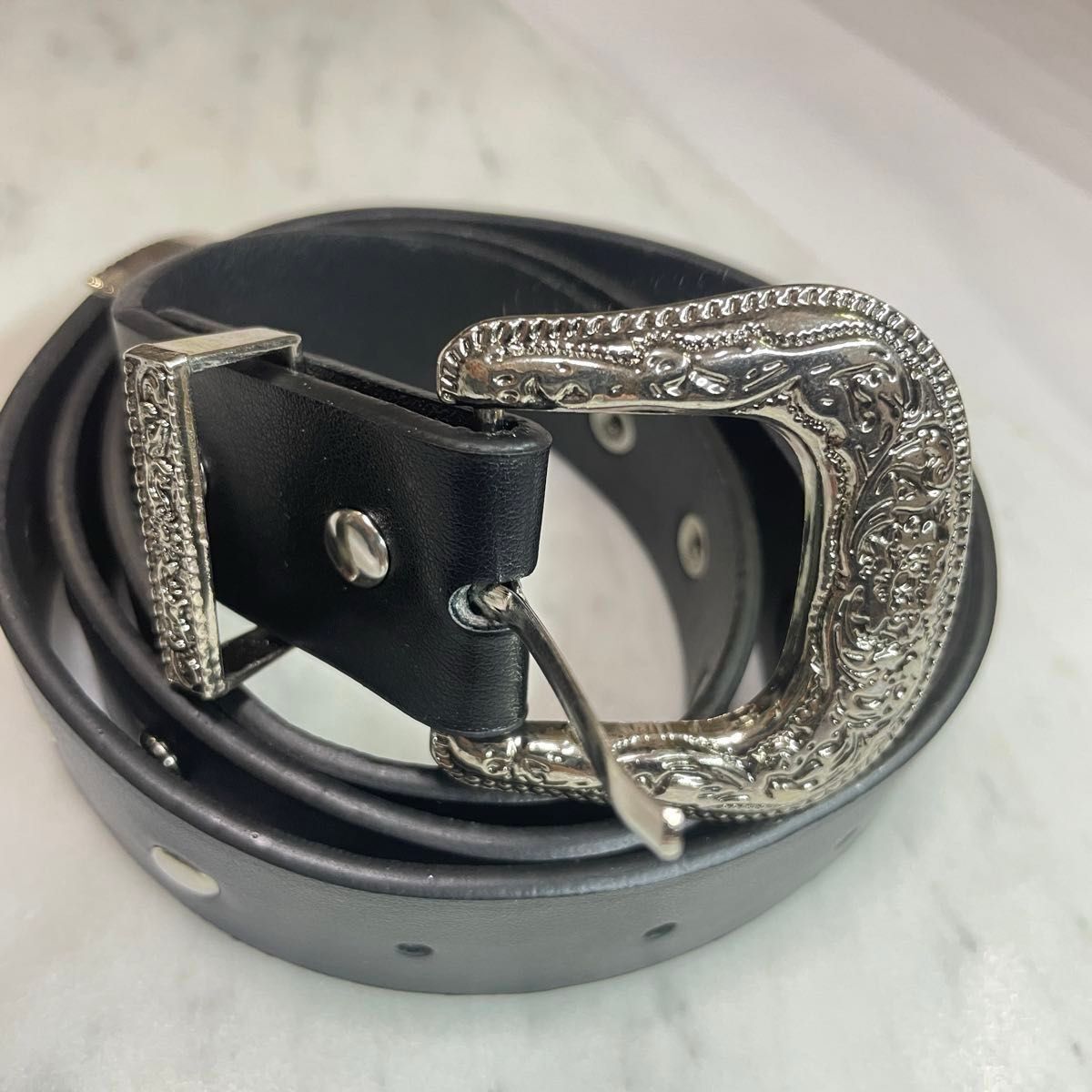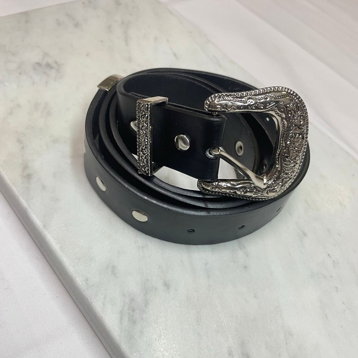 黒のウェスタンベルトは、シルバーバックルのヴィンテージ風装飾が魅力。どんなスタイルにも洗練されたアクセントを加え、スタイリッシュな装いを演出します。