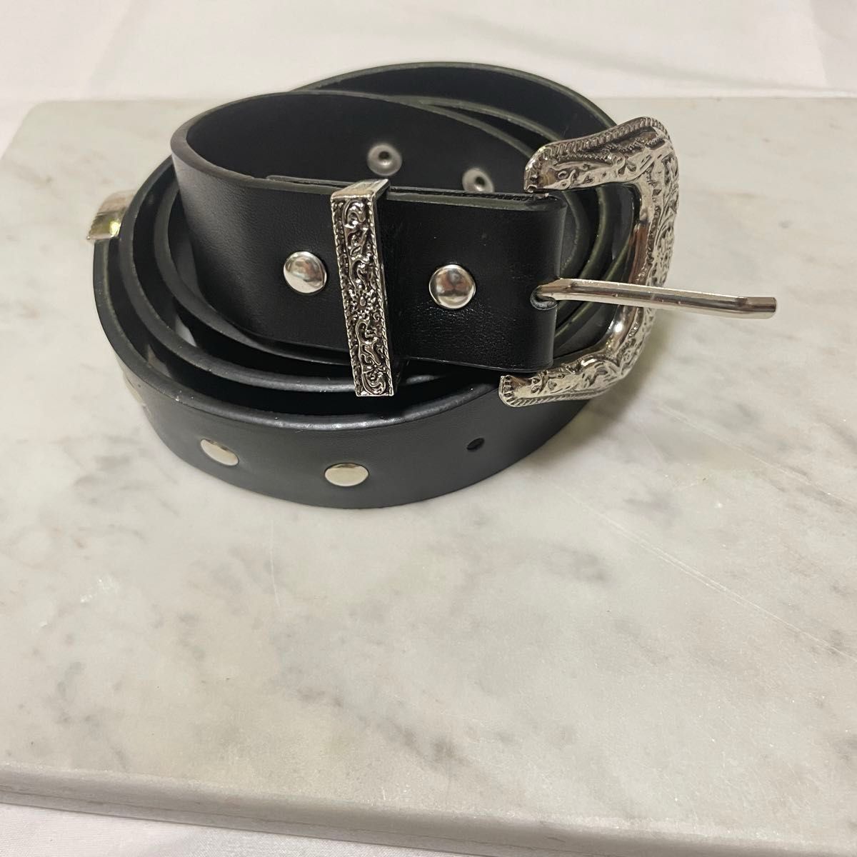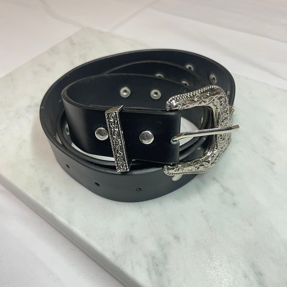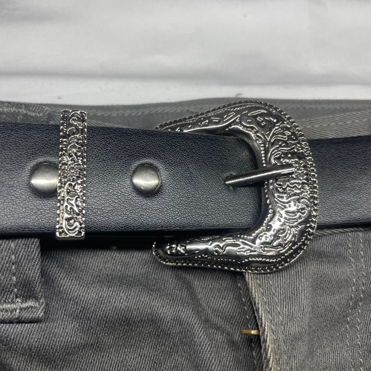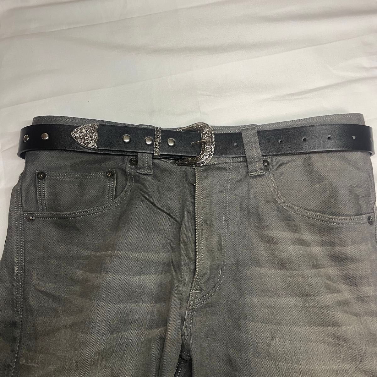 黒のウェスタンベルトは、シルバーバックルのヴィンテージ風装飾が魅力。どんなスタイルにも洗練されたアクセントを加え、スタイリッシュな装いを演出します。
