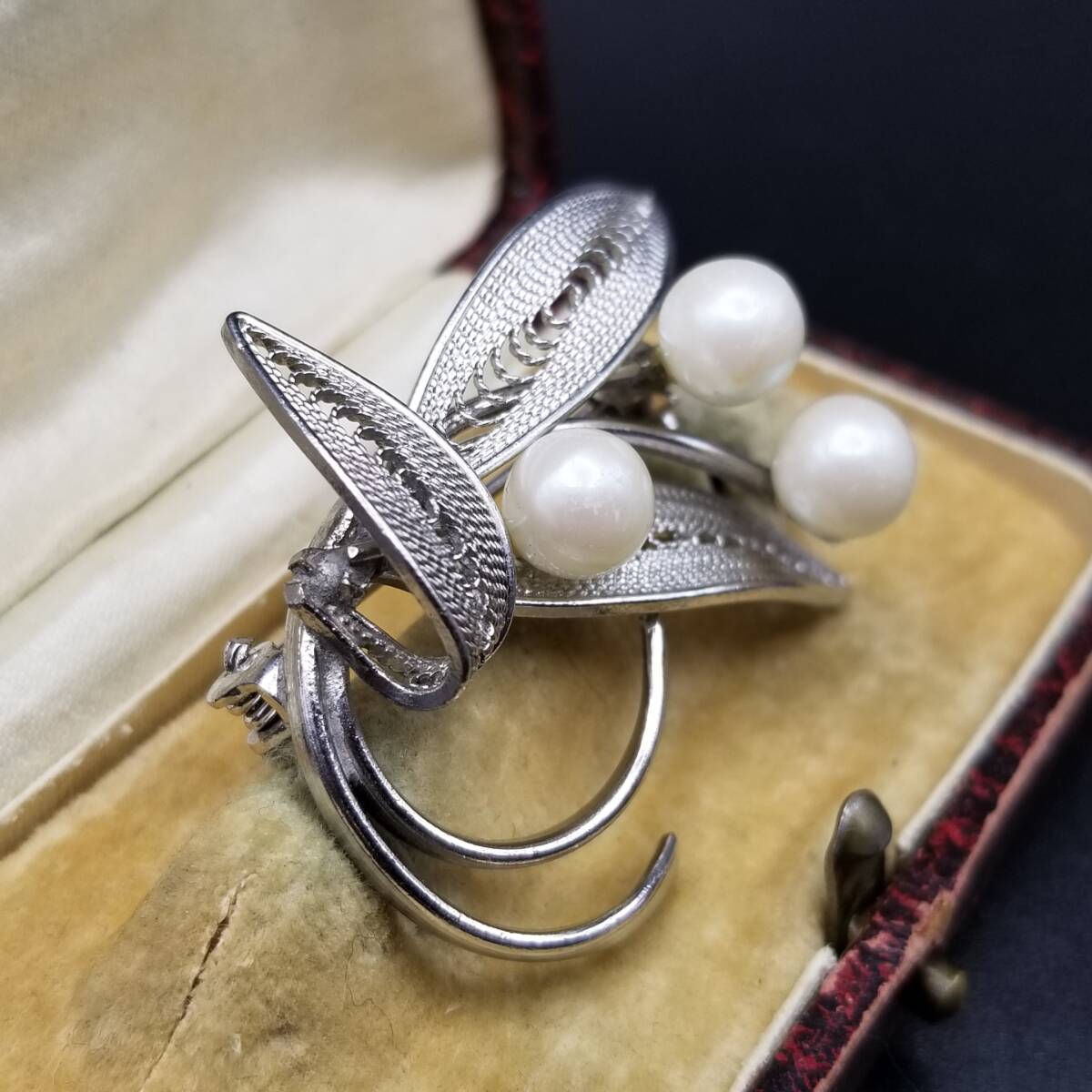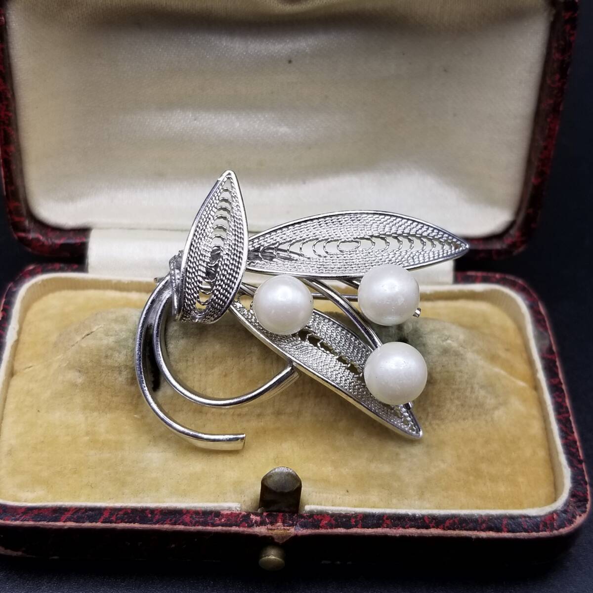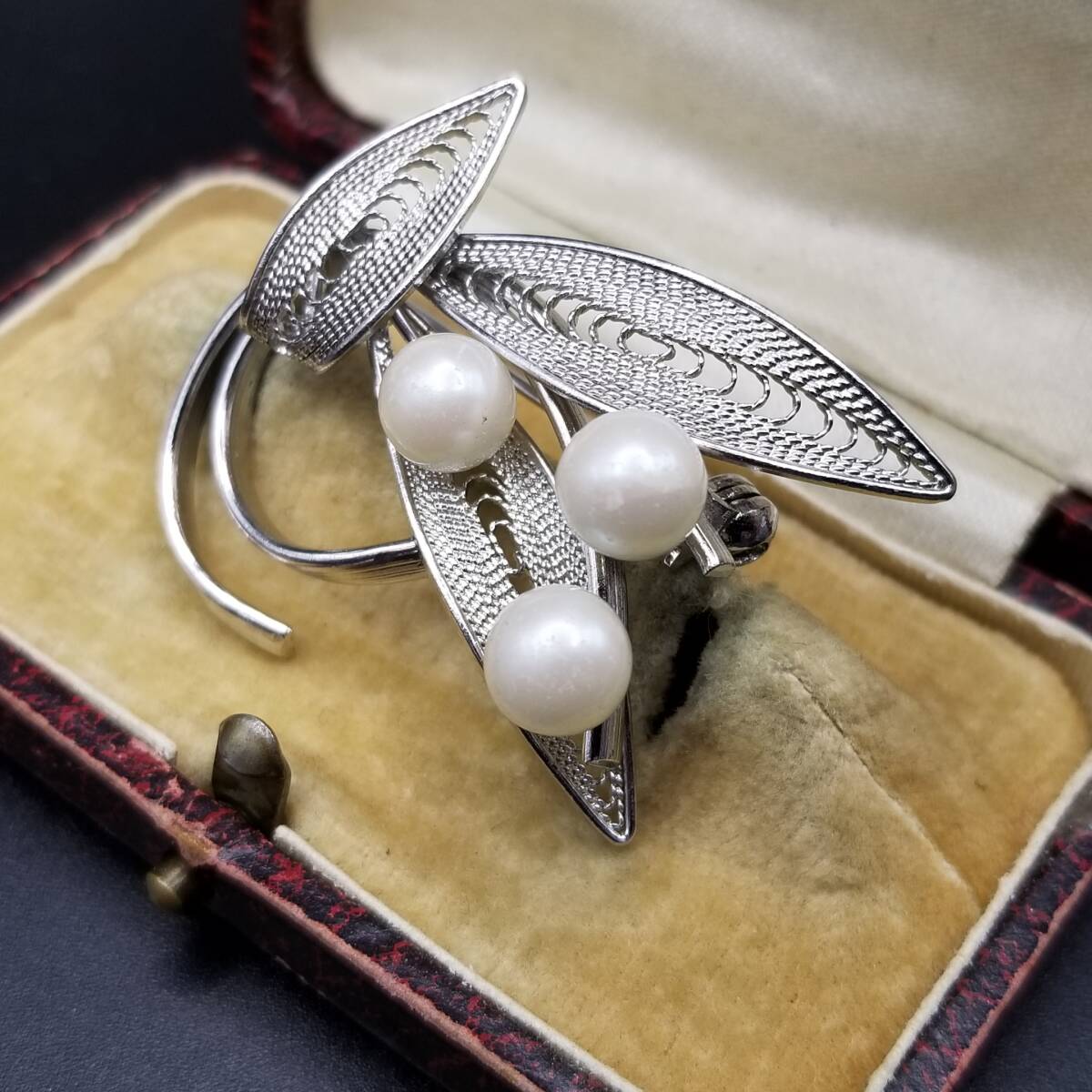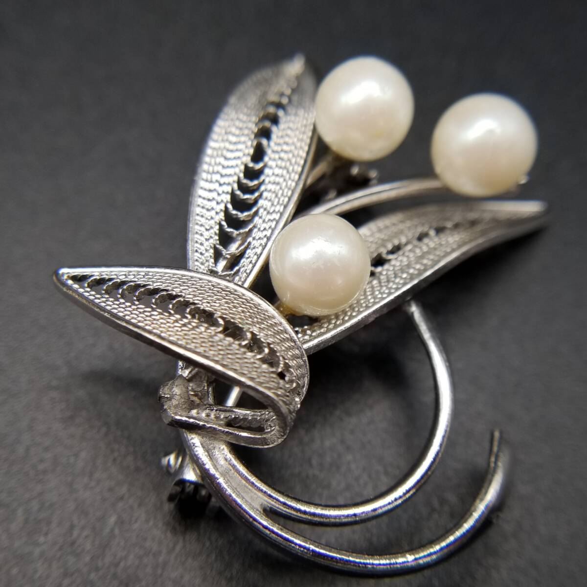 50'60's頃 JAPAN刻印 パール装飾 フィリグリー ヴィンテージ フローラル ブローチ シルバートーン レトロ エレガント 存在感 AAZ-1
