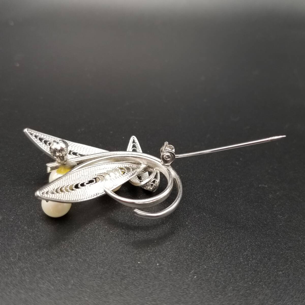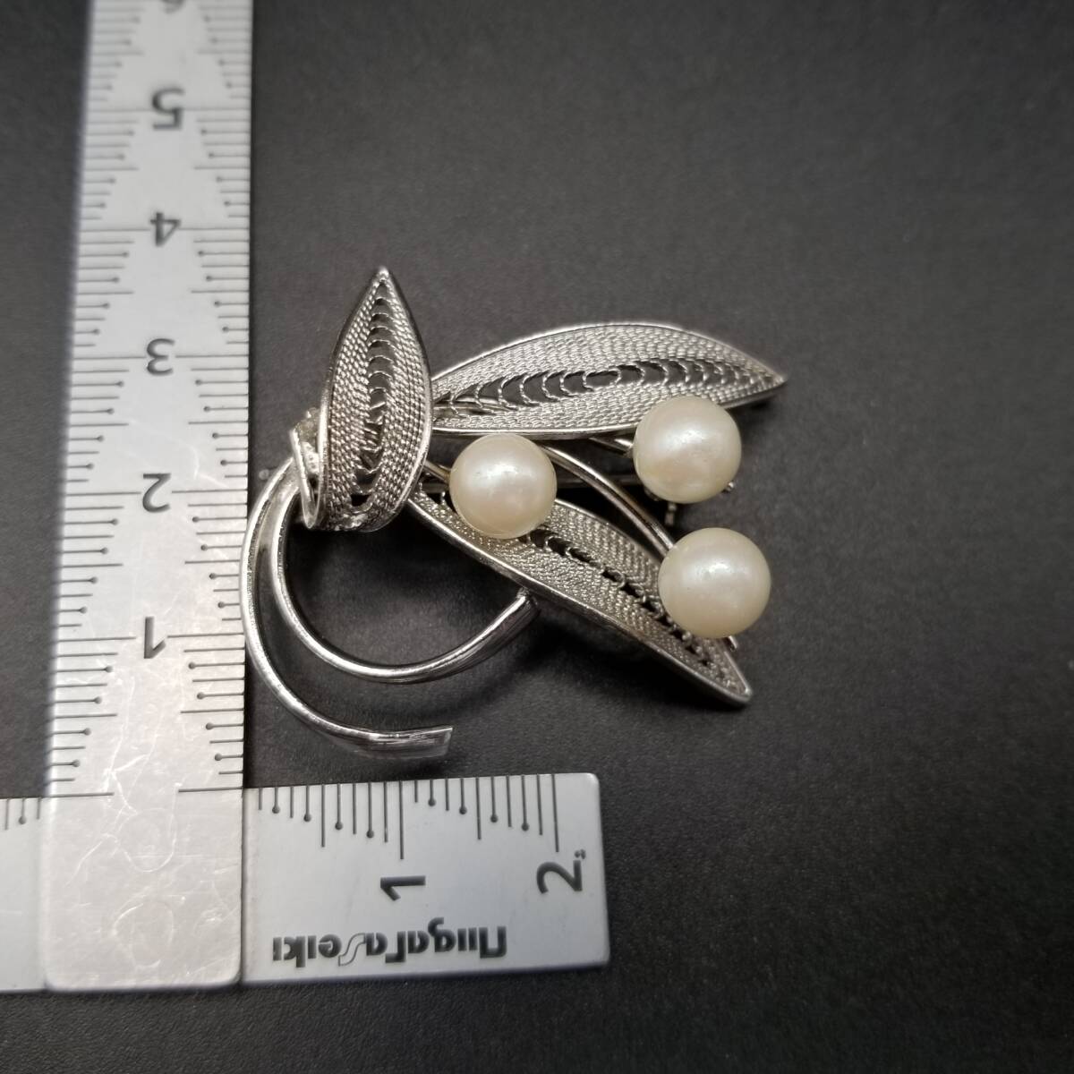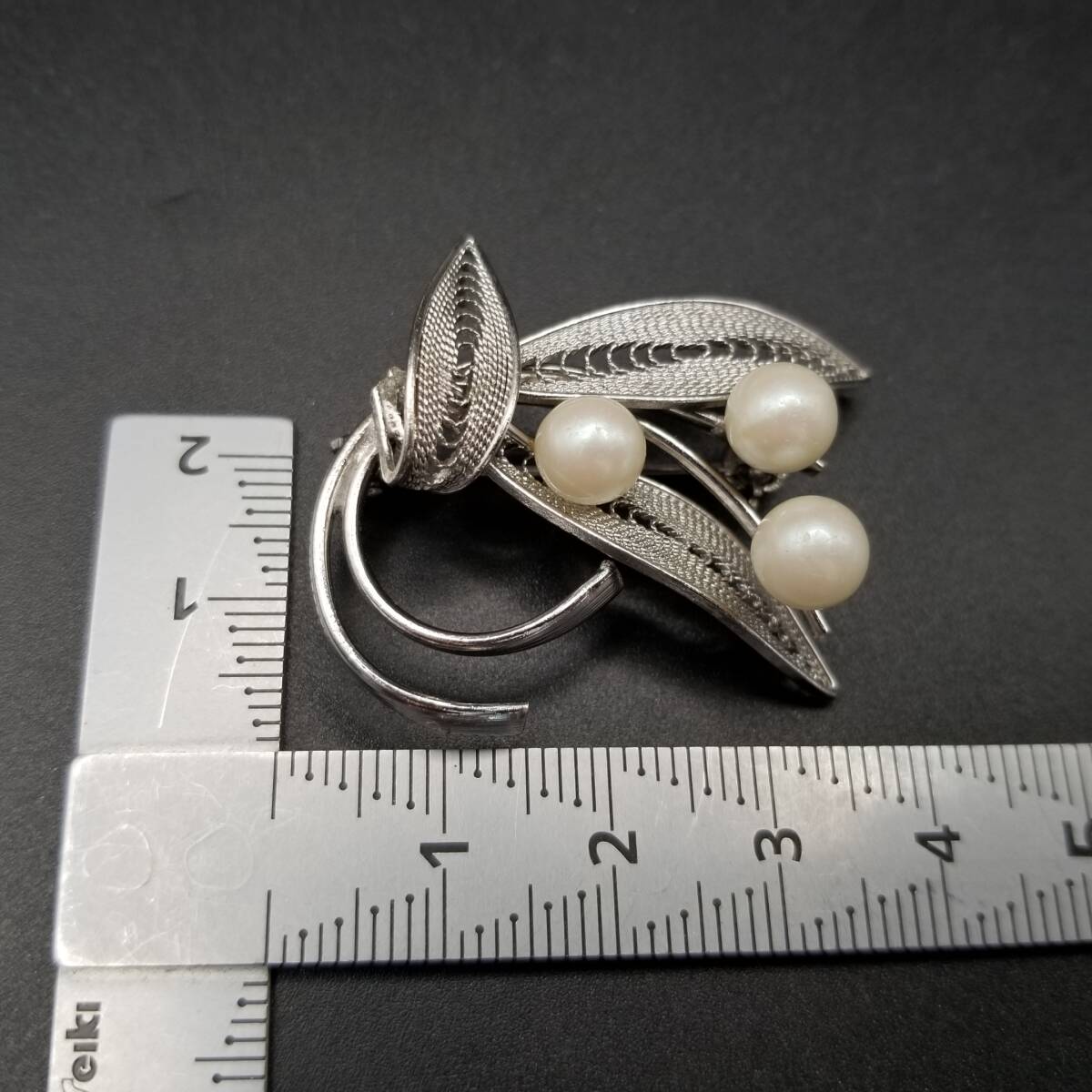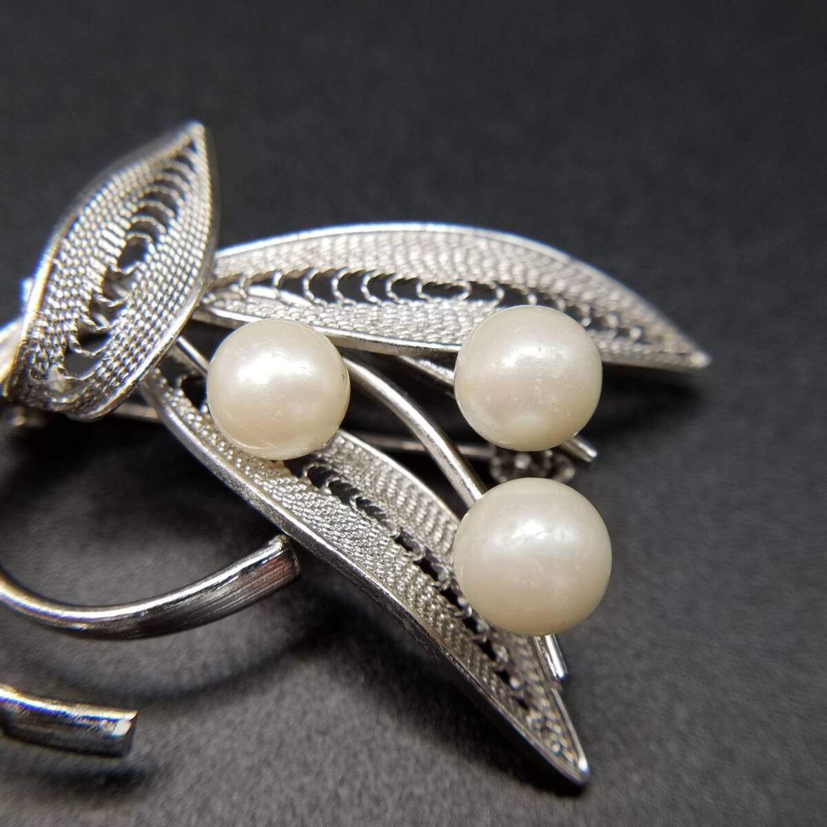 50'60's頃 JAPAN刻印 パール装飾 フィリグリー ヴィンテージ フローラル ブローチ シルバートーン レトロ エレガント 存在感 AAZ-1