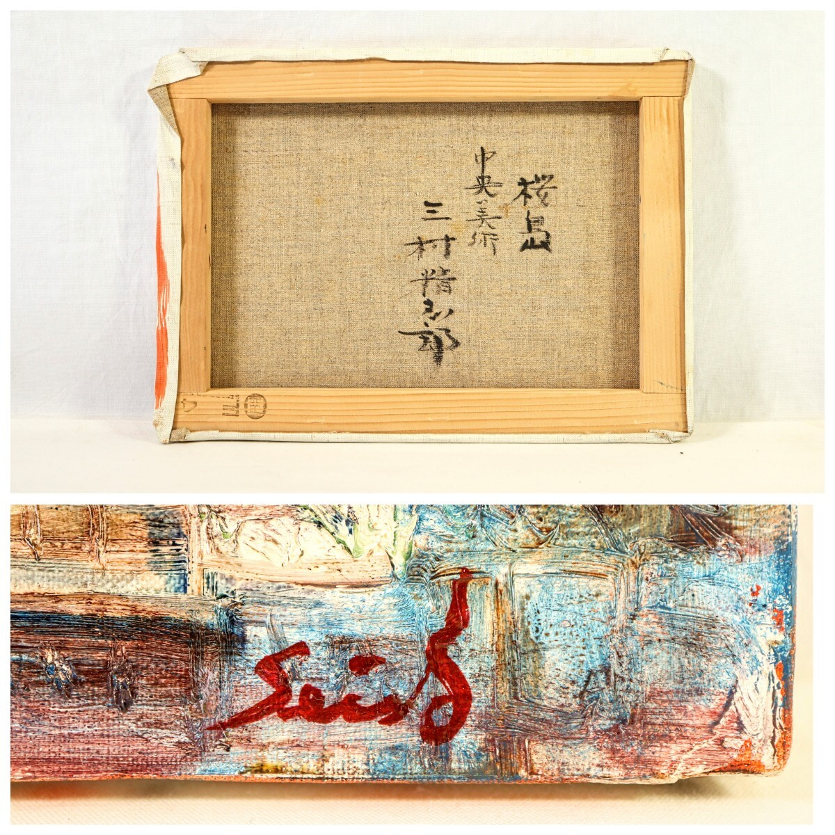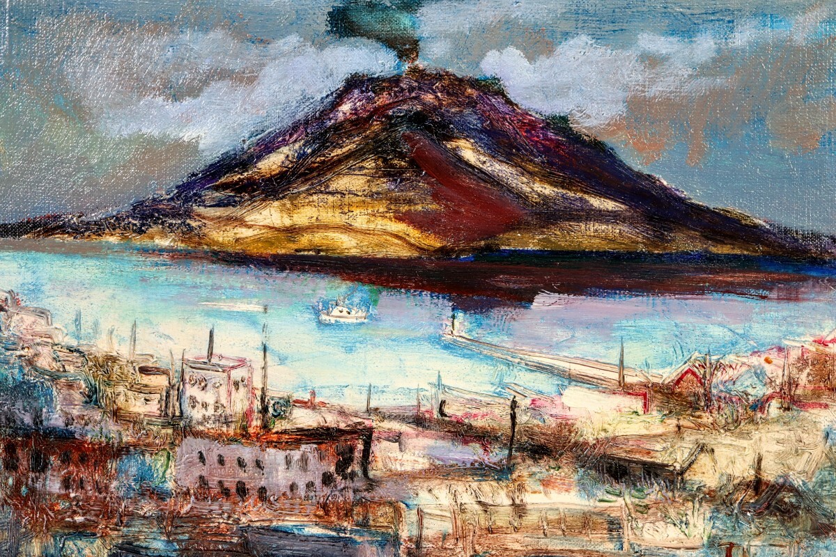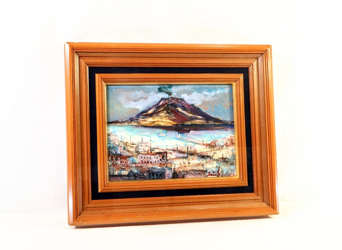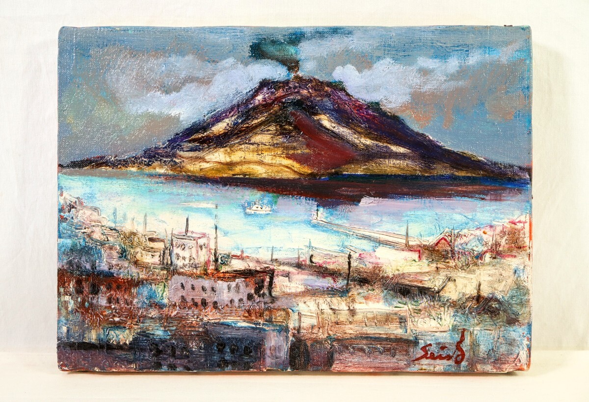 真作 三村精志郎 油彩「桜島」画寸 F4 兵庫県出身 朔風会会長 児島善三郎に師事 鹿児島の市街地と錦江湾に噴煙を上げる雄大なる雄姿 10187