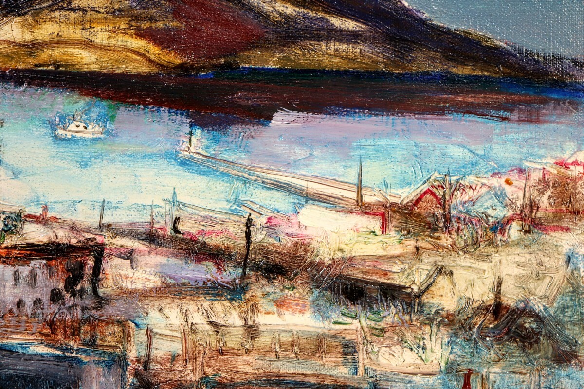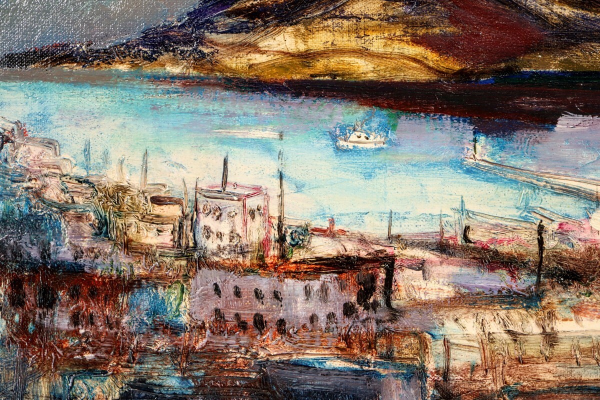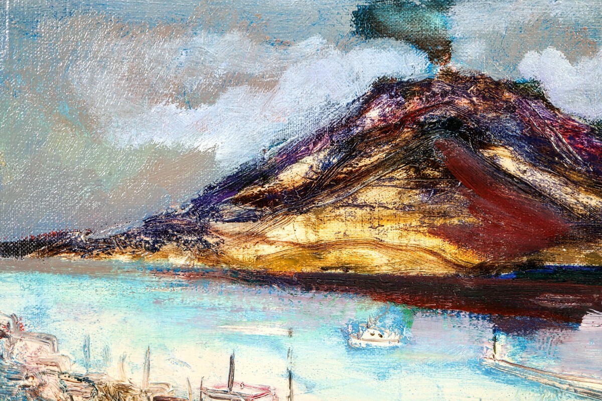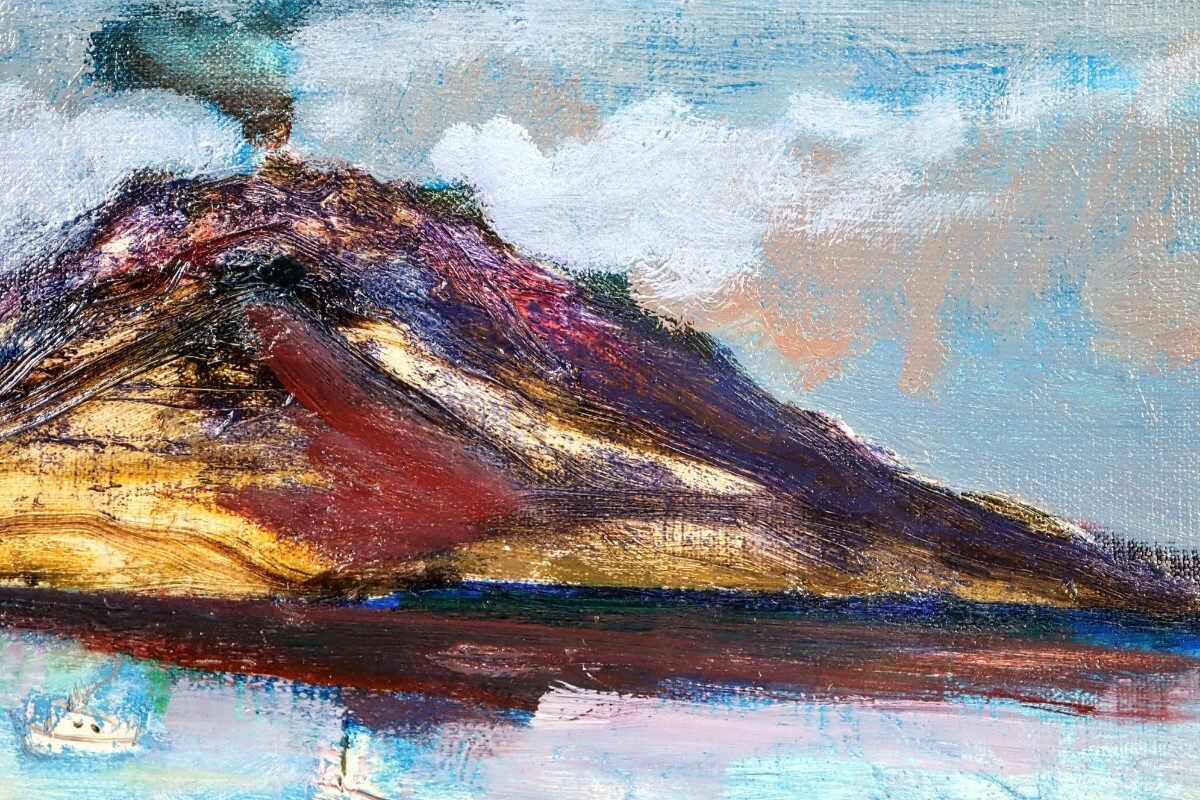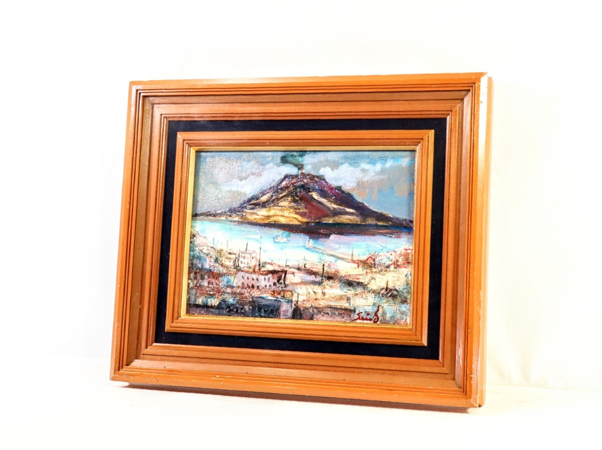 真作 三村精志郎 油彩「桜島」画寸 F4 兵庫県出身 朔風会会長 児島善三郎に師事 鹿児島の市街地と錦江湾に噴煙を上げる雄大なる雄姿 10187