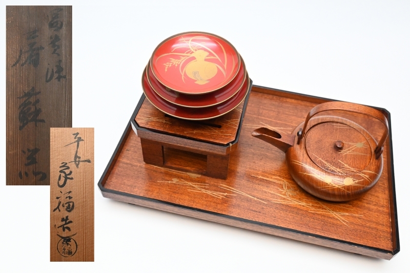 ■ 平安象福 時代 屠蘇器 揃い■ 天然木 木箱入 ■ ■ 木地呂塗 屠蘇器 蒔絵[松竹梅]三盃 [鯉 打ち出の小槌 等] 盃台■ 屠蘇台サイズ : 約35cm ×約23cm ×約4cm 三盃サイズ : 大 径約11.5cm / 中 径約10.5cm / 小 径約9.3cm 盃台サイズ : 縦横約12.3cm ×h約8cm 屠蘇サイズ : 約16cm ×約12cm ×h約12cm 木箱サイズ : 約37cm ×約24.5cm ×h約13cm お目に留めて頂いた方へお譲り致します。 本日のお買得品のお仲間に是非いかがでしょうか。 ※ 画像以外の付属品はありません。 ■整理品 中古品相応 経年相応 入手状態でお譲り致します。 時代を経た古いお品物で、新品新品同様ではありません。大きな傷みはありませんが、 経年・保管状況による劣化・擦れ・塗剥・ 汚れはご承知おき願います。 *像福は象彦七代目が、1910年に分家創業 検索結果です。 多少の欠点もあろうかと思いますが、趣のあるお品物です。盃はオリジナル かどうか不明です。画像からご判断頂ける方、 しばらくの間眠っていた古いお品物とご理解頂ける方のみご検討願います。 ご入用の方へ! お見逃しなく! ■ご案内 お品物は、経年中古品現状渡しでございます。新品ではありません。 ノークレーム・ノーリターンとさせていただきます 。 ※画像に付きましては、お使いの環境モニター、ブラウザ等の違い、光反射の影響等によ り色の見え方が実物と 異なる場合がございます。予めご了承願います。 又、タイトル・コメントはあくまでも主観です。見落としなどがあるかもしれませんので ご参考程度とお考え願います。 お品物に関する情報は、箱やお品物上にあります印刷・記載等から 拾っております。 未使用と思われるお品物でありましても、中古で入手しているお品でございますので メーカー等の本物 保証をするものではありません。 尚、見解には個人差がございますので神経質な方はご入札を御控え願います。 検索ワードとして、タイトルには出品商品と関連のない単語も含まれる場合があります。 ご注意:評価が著しく悪い方、新規IDの方の入札・ご落札を削除する場合がございます。 ※ 採寸誤差、誤認、誤記等につきましてはご容赦願います。 紙箱 共箱等納品の場合は基本的に古さがございます。劣化、書き込み等がある場合もございます。 完璧ではありません。 ■お取引について P10355 6518■ 2日以上ご連絡を頂けない場合はキャンセル致します。 お支払いは、落札後3日(72時間)以内にお願いしております。 |