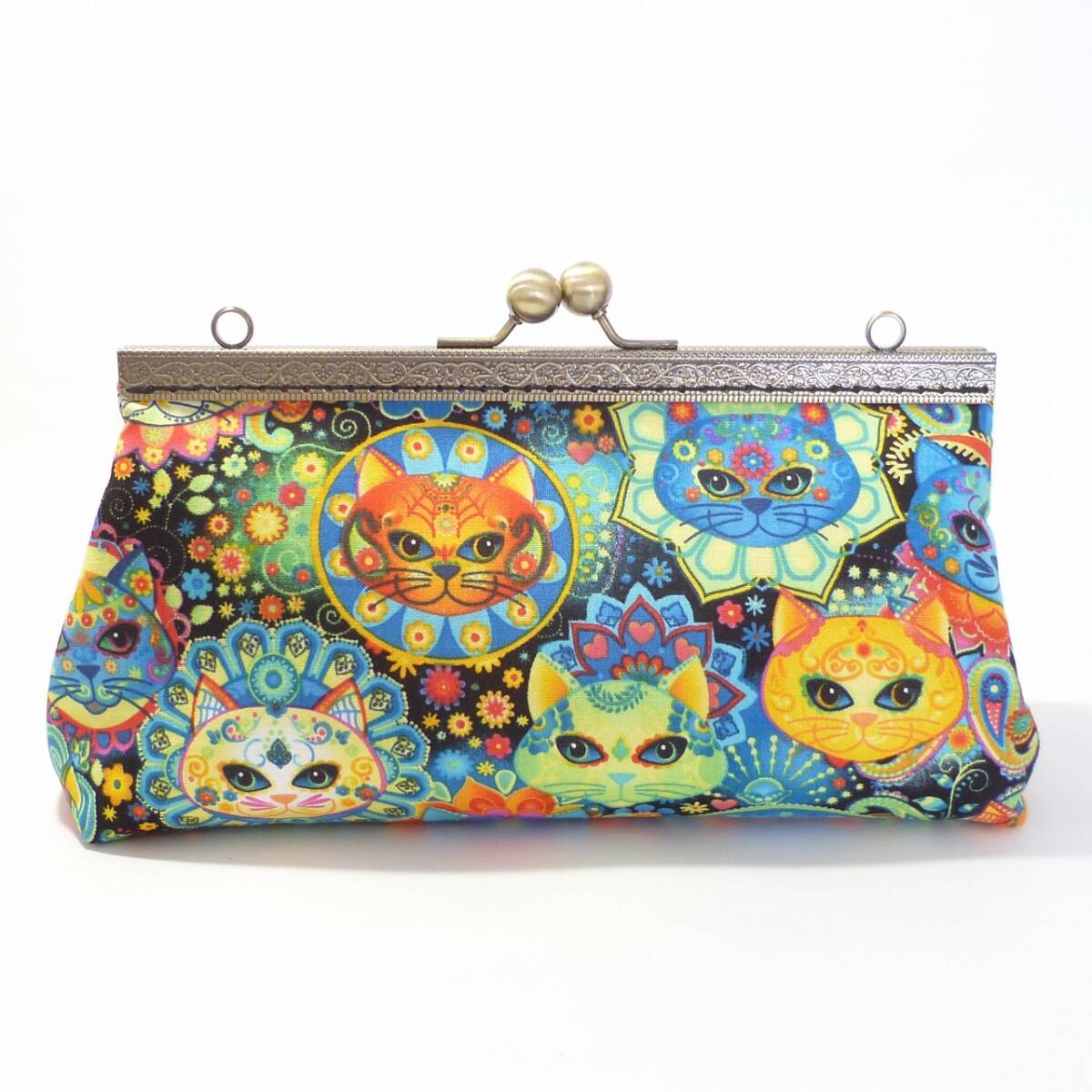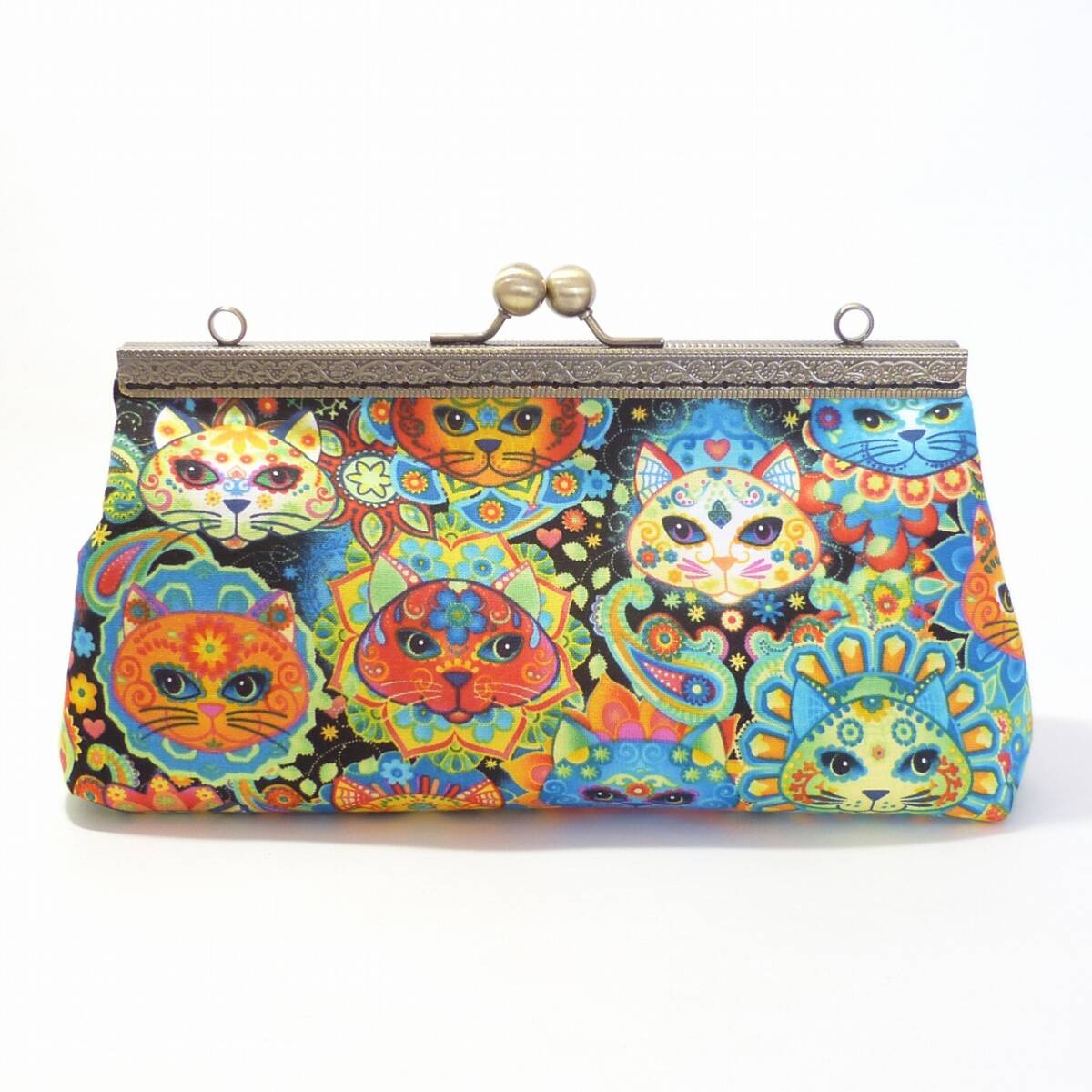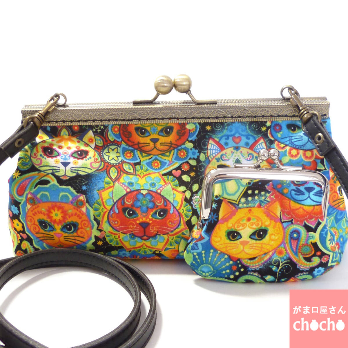 セット商品★がま口ショルダーバッグ&小銭入れ メキシコの伝統柄風 猫柄 ネコ ハンドメイド G376