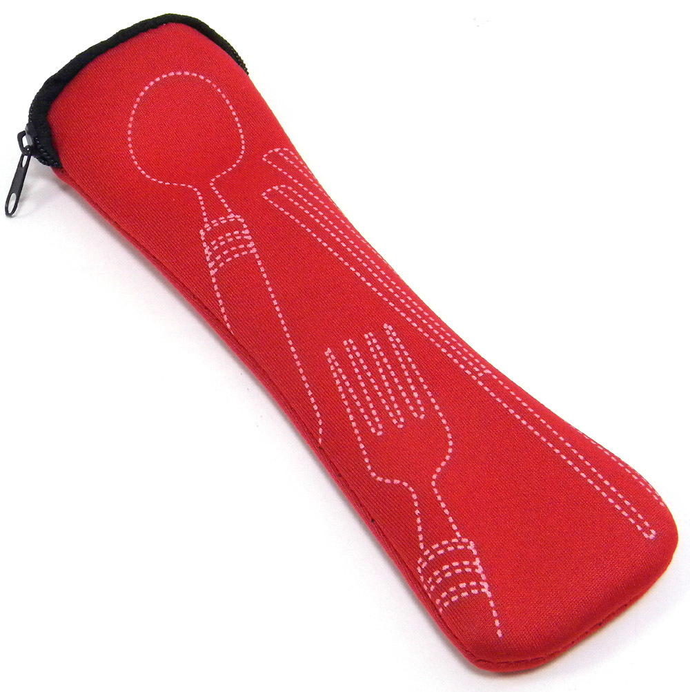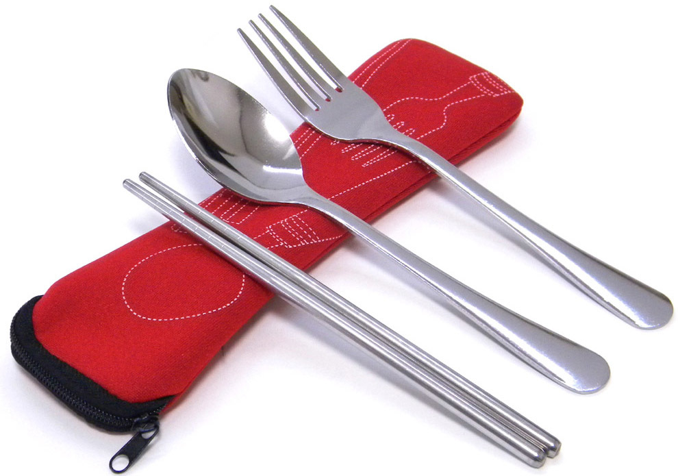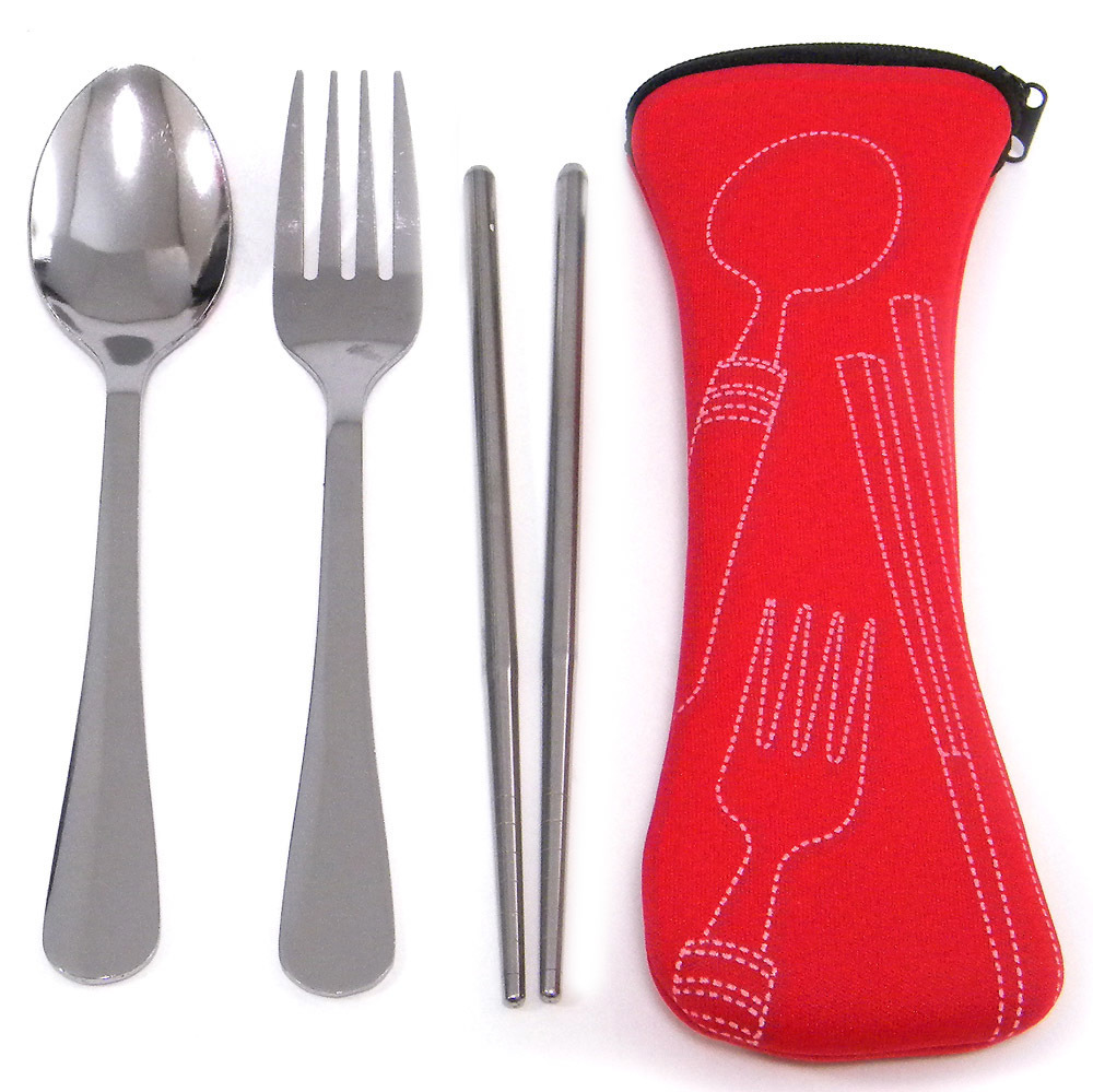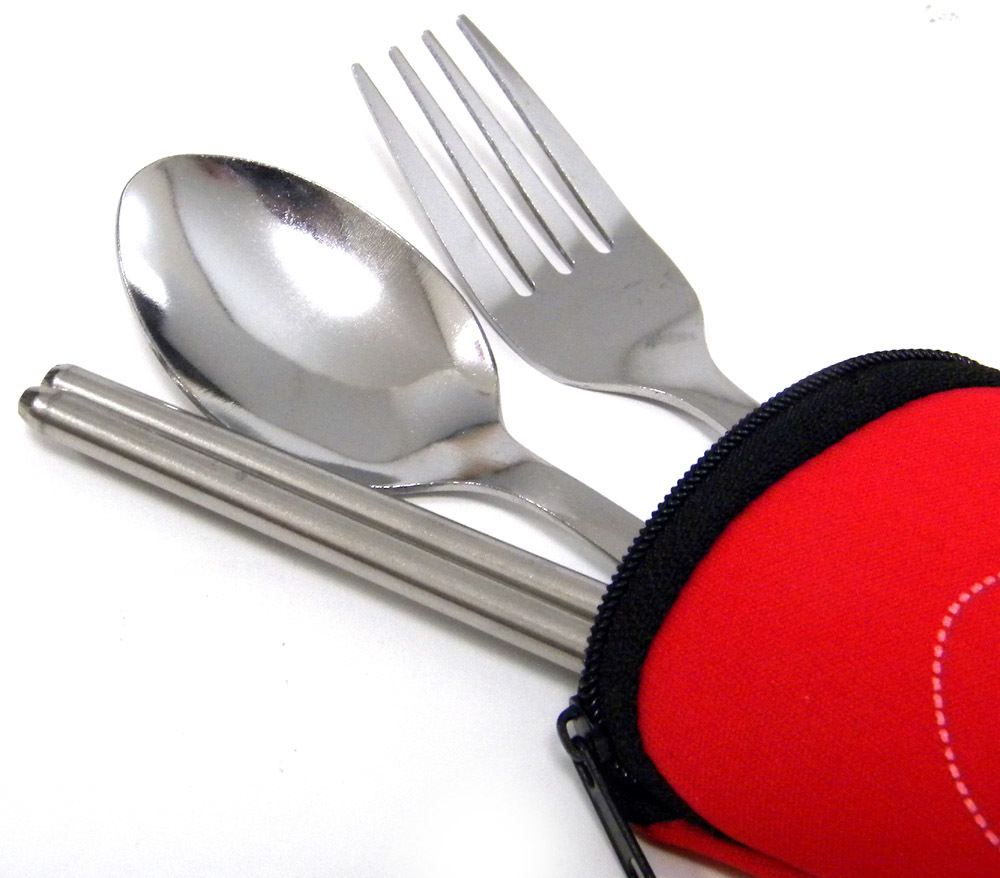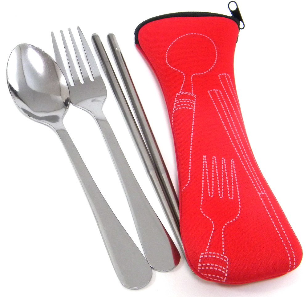 ★ ステンレス製 / スプーン・フォーク ・箸(はし)3点セット / 収納ポーチ(赤)★ 送料無料 ★