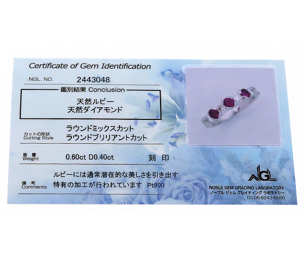 | 石目 | ルビー3石 合計0.60ct ダイヤ4石 合計0.40ct | |||||||||||||||||||||||||||||||||