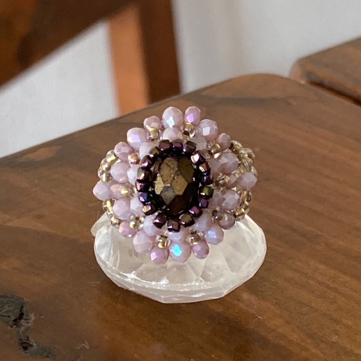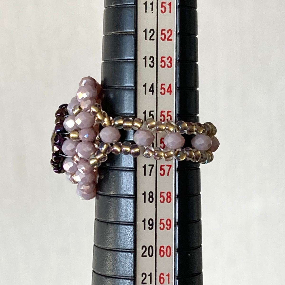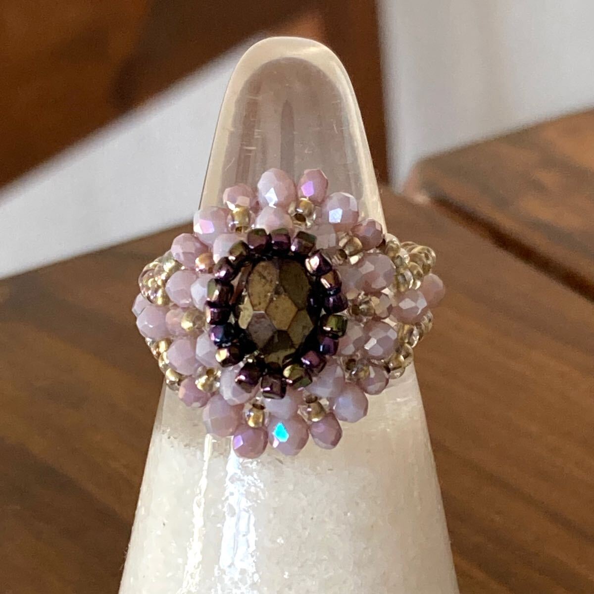 9mmのブロンズのナツメチェコビーズ、3mmの薄パープルのボタンカットビーズ、メタリックパープル、クリアゴールド系の丸小ビーズで作ったリングです。