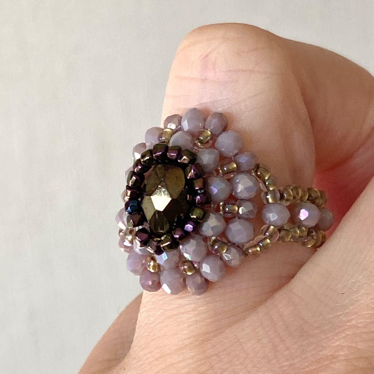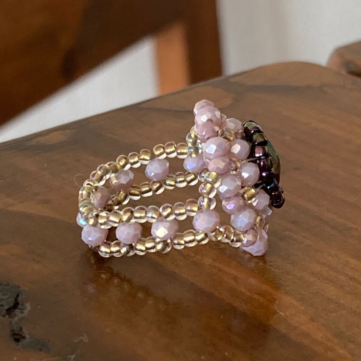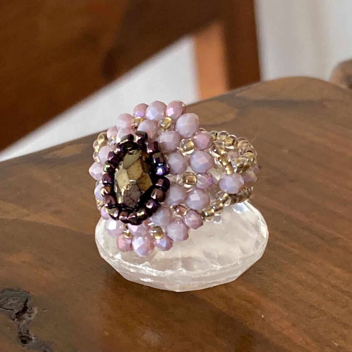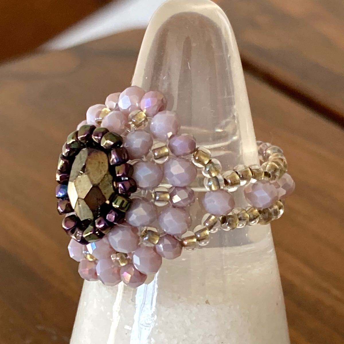 9mmのブロンズのナツメチェコビーズ、3mmの薄パープルのボタンカットビーズ、メタリックパープル、クリアゴールド系の丸小ビーズで作ったリングです。
