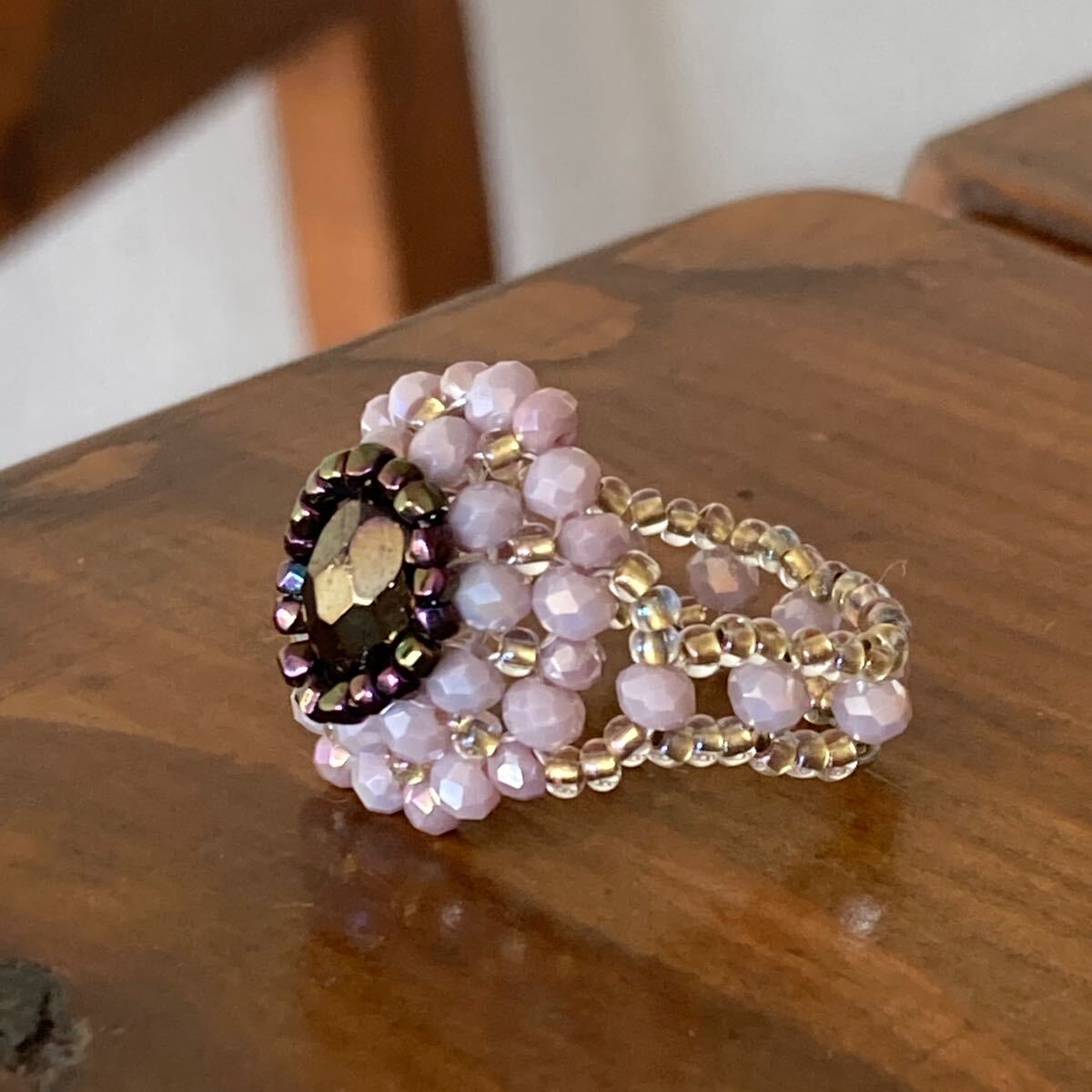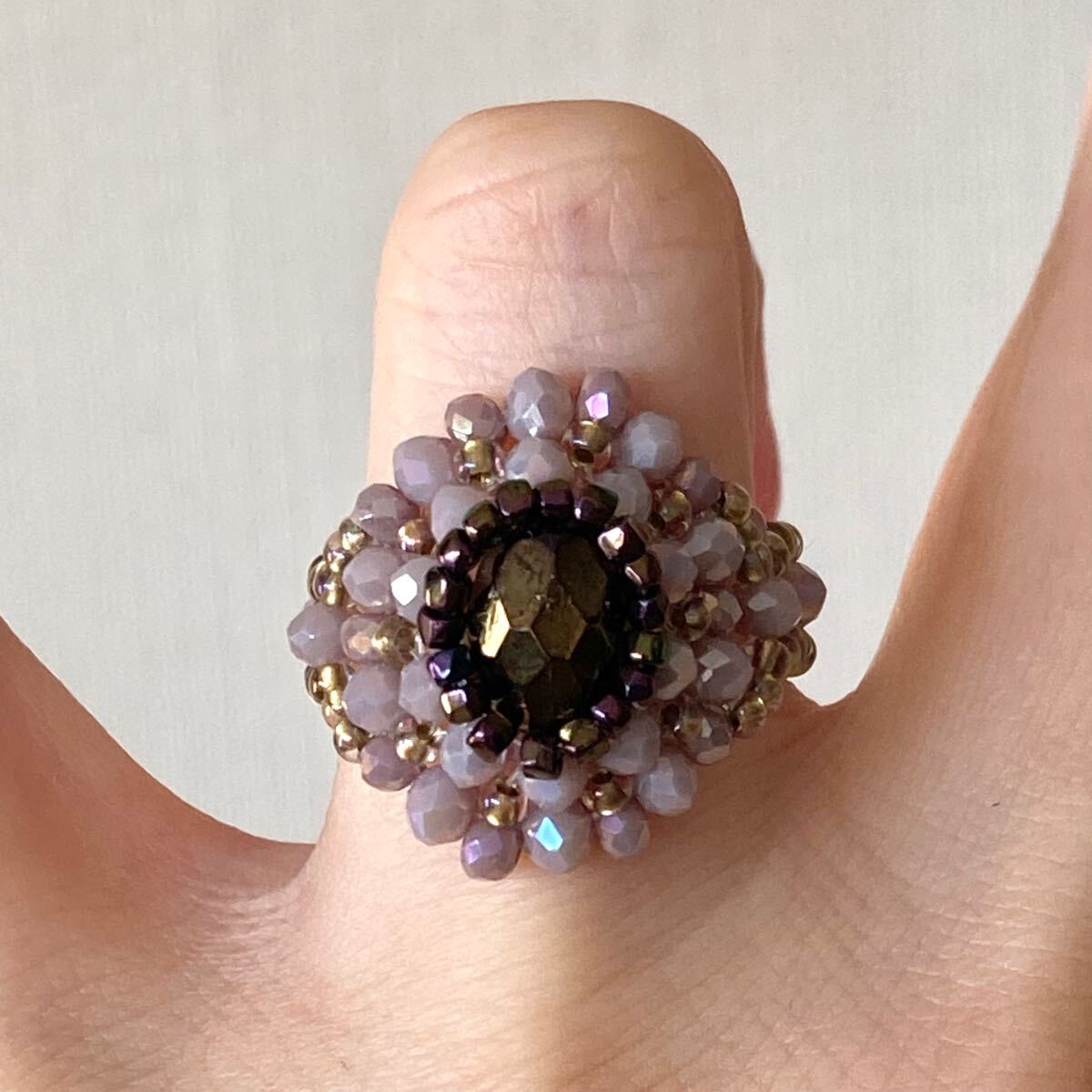 ブロンズのナツメチェコビーズの周りをボタンカットビーズ等で細かく3重に編んだデザインのリングです♪