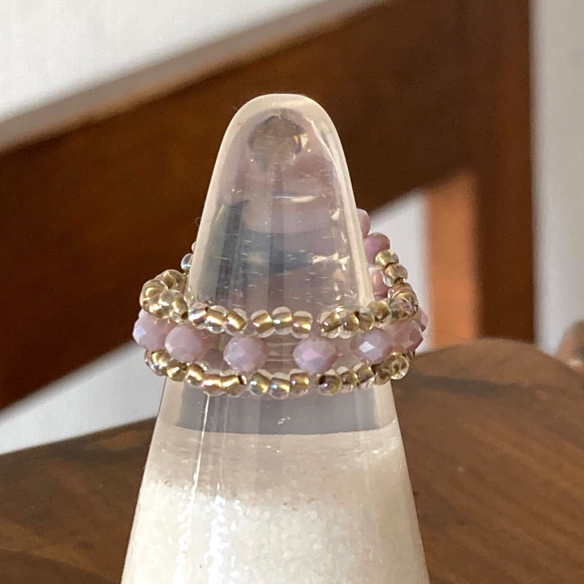 ビーズ リング  指輪 ハンドメイド ナツメビーズとボタンカットビーズの3重リング ブロンズ×薄パープル 15-17号 です。