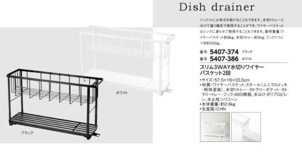 【商品番号】 5407-374 / 5407-386 【商 品 名】 スリム3WAY水切りワイヤーバスケット2段 1台 |