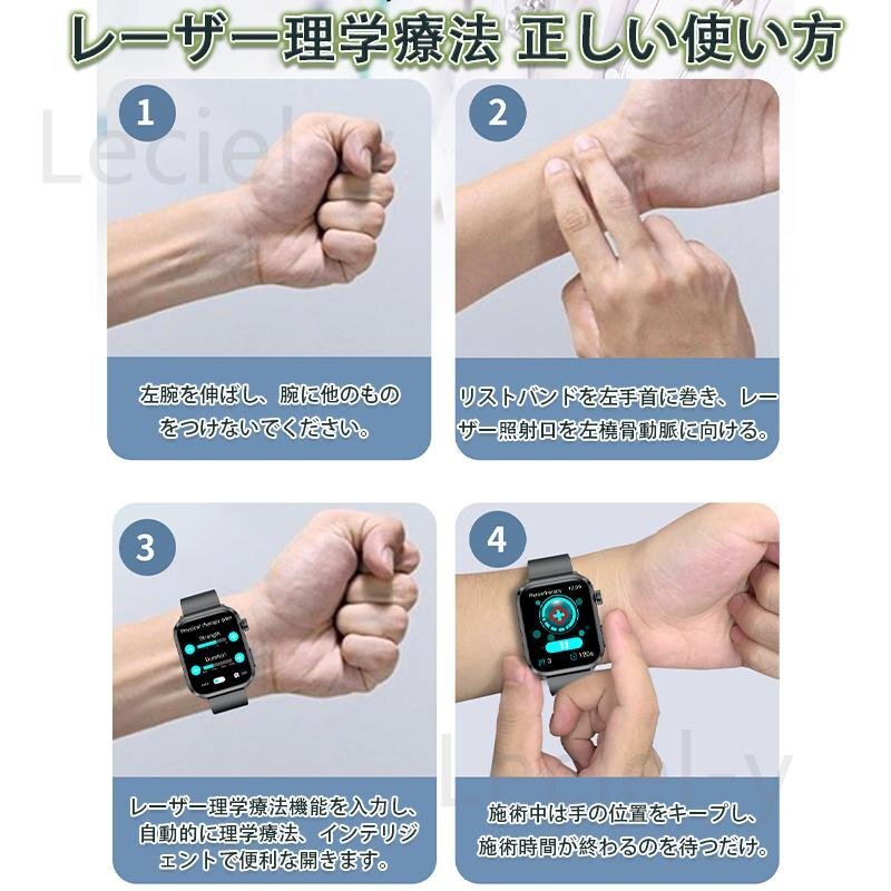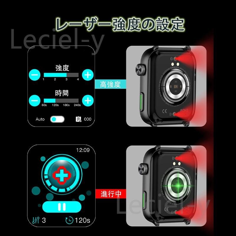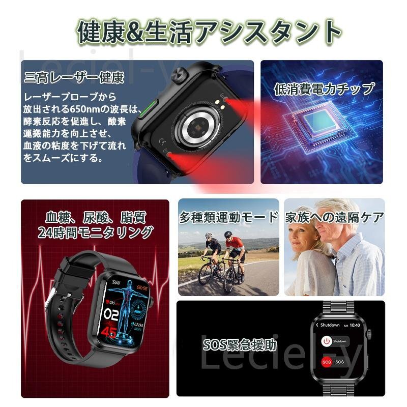 ●24H健康管理:レーザー理学療法、血糖値測定、血中脂質、尿酸、ECG心電図、24時間体温監視、動態心拍数、アラート、血圧測定、血中酸素、睡眠監視などの測定機能付き