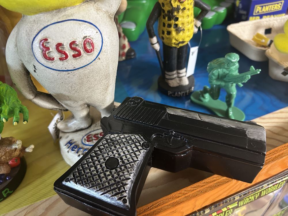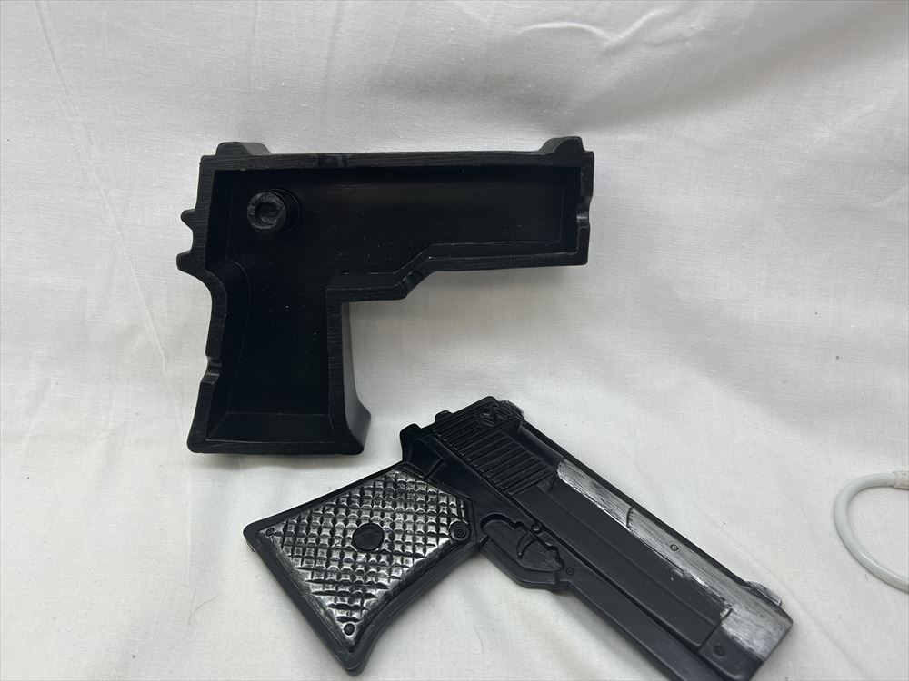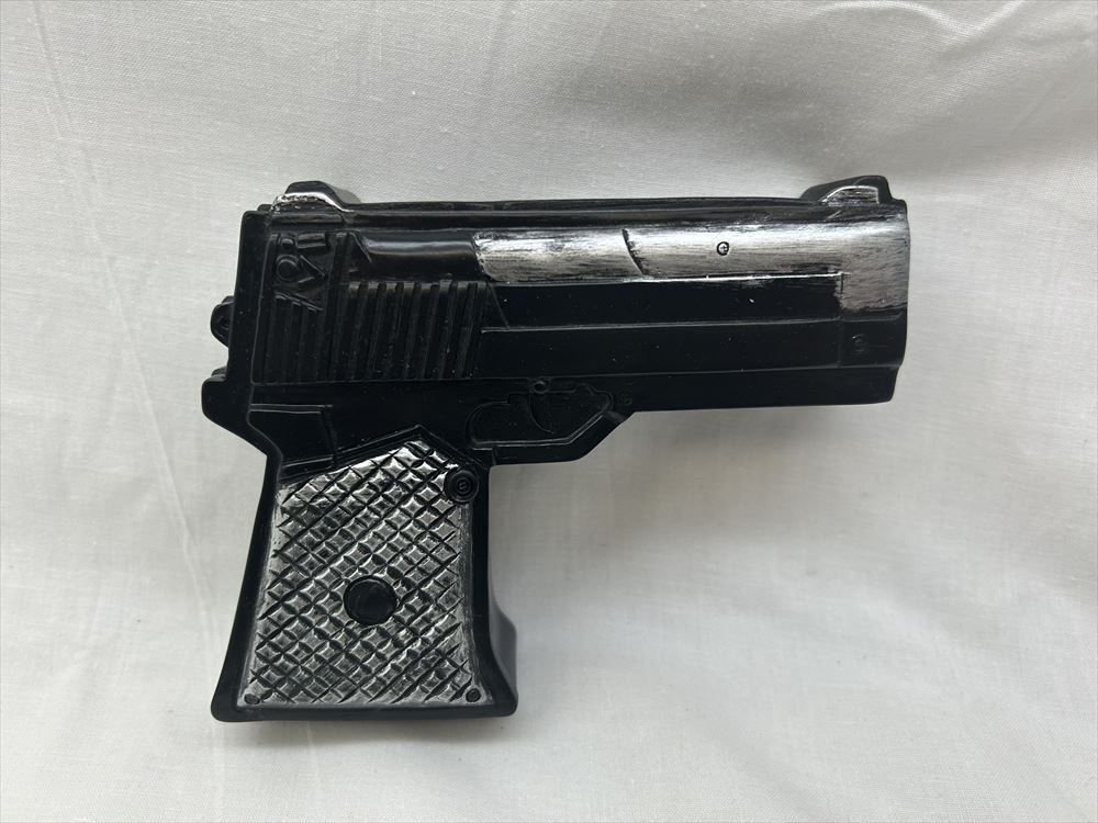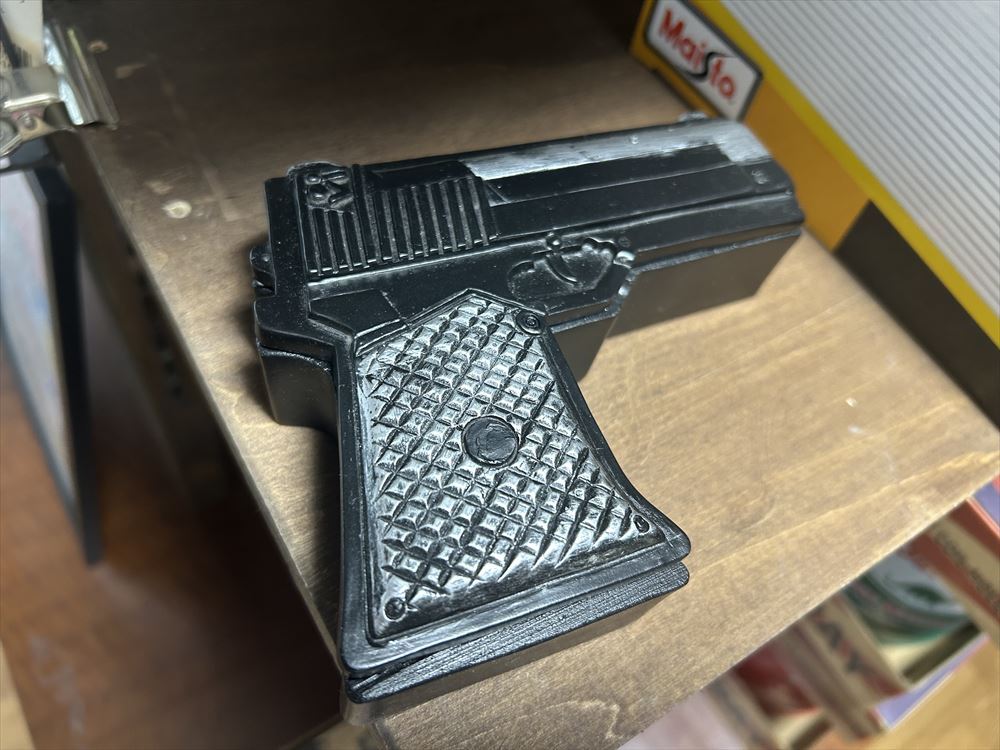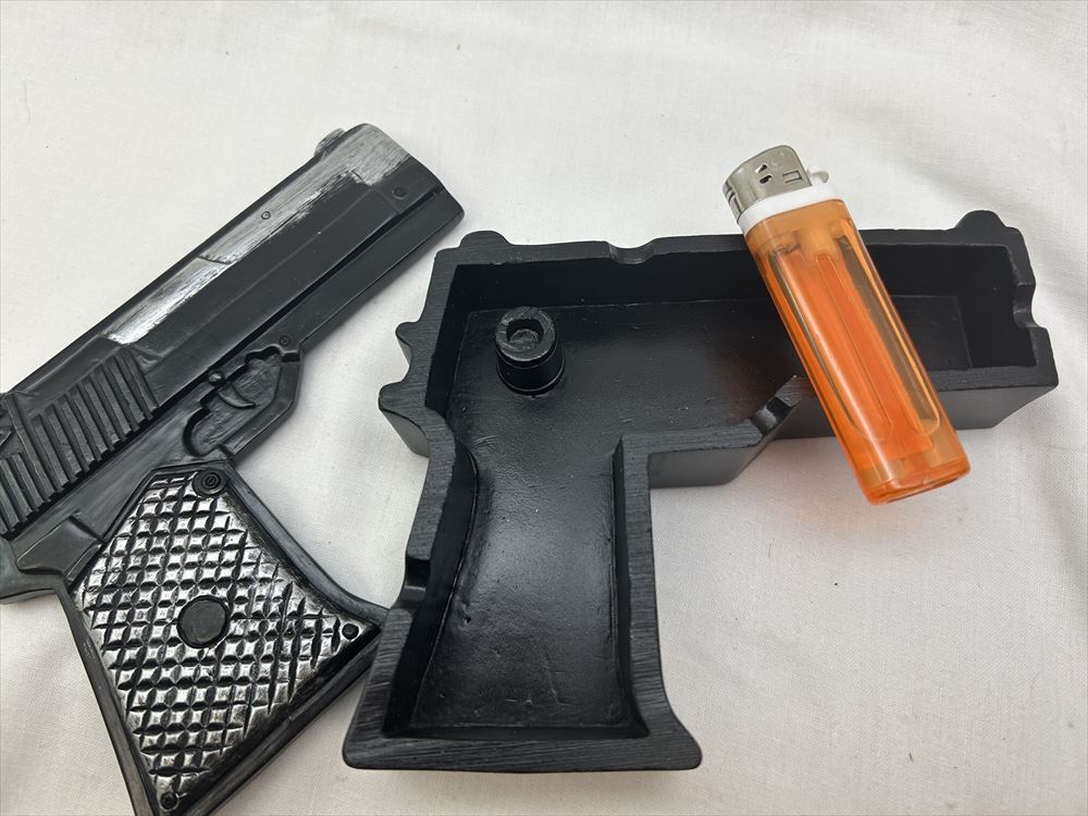 【101318】蓋付き灰皿!拳銃の形をしています!天面が蓋になっているデザインです。中には火消しが付いております。蓋をしておけば、灰も飛び散らず、みた目もぱっと見灰皿とわからないデザインです。【サイズ】W160/D115/H40mm【素材】ポリストーン製