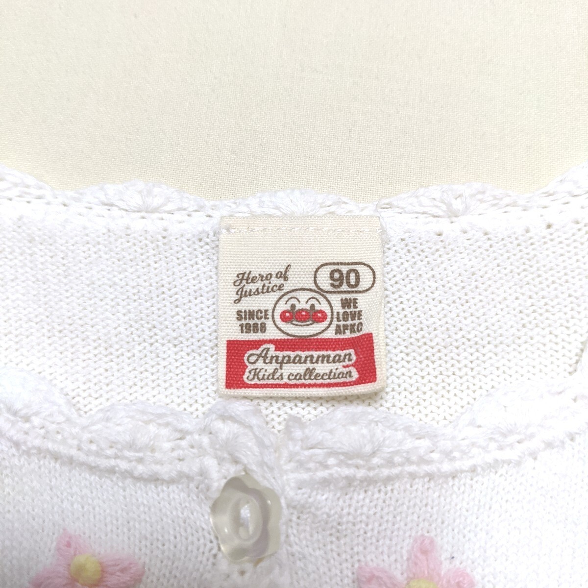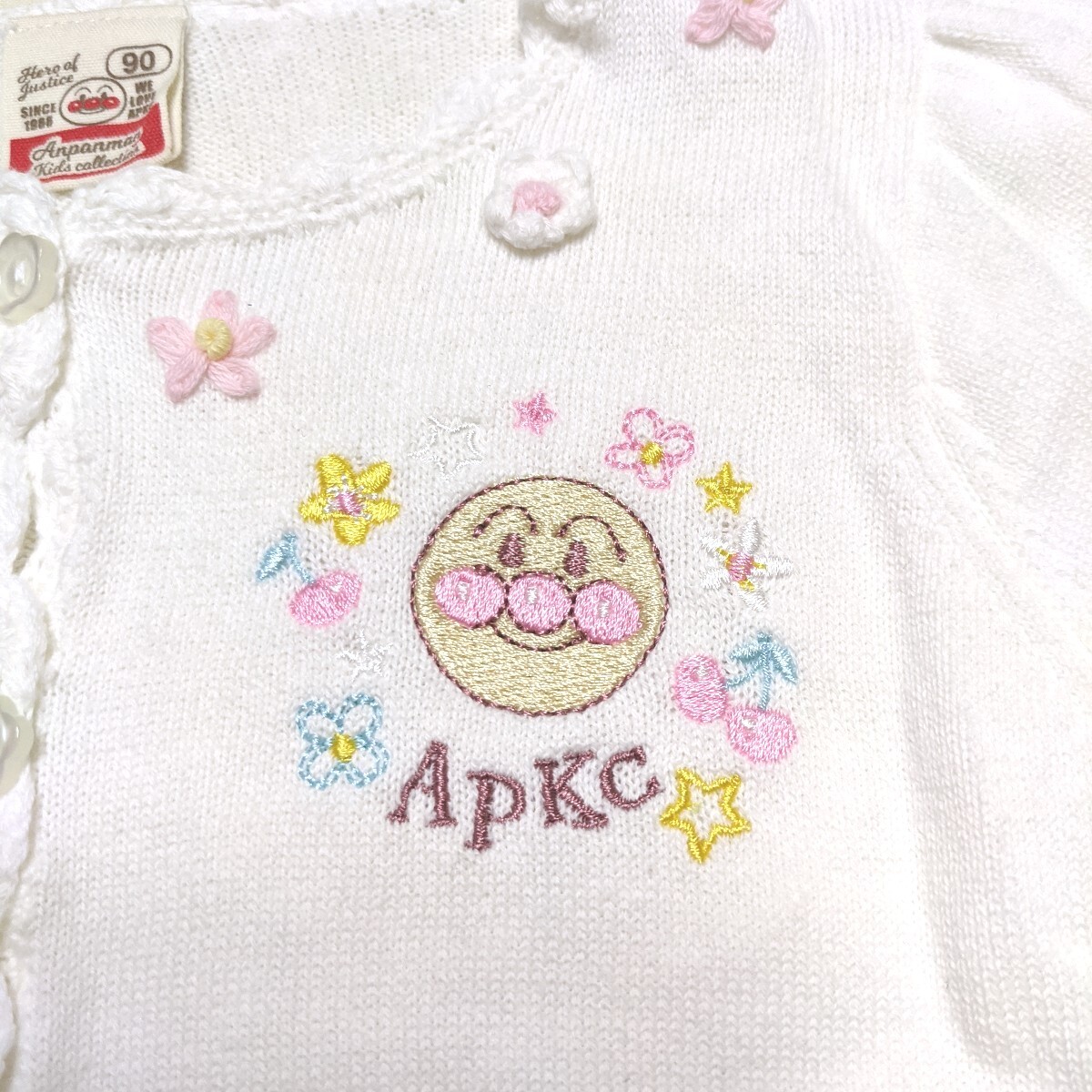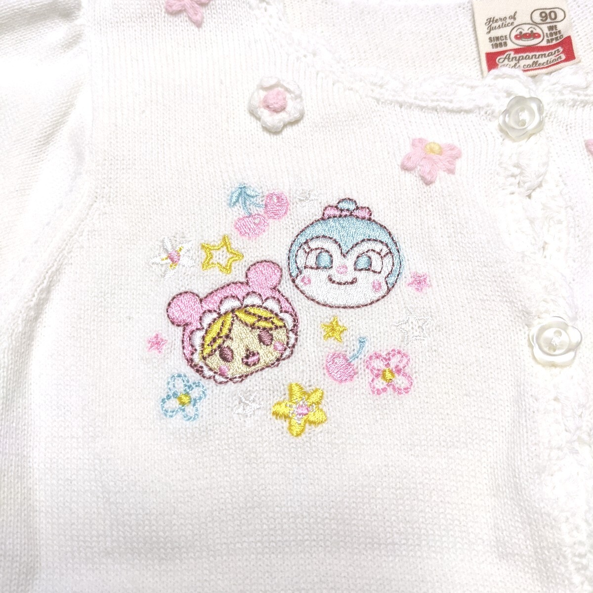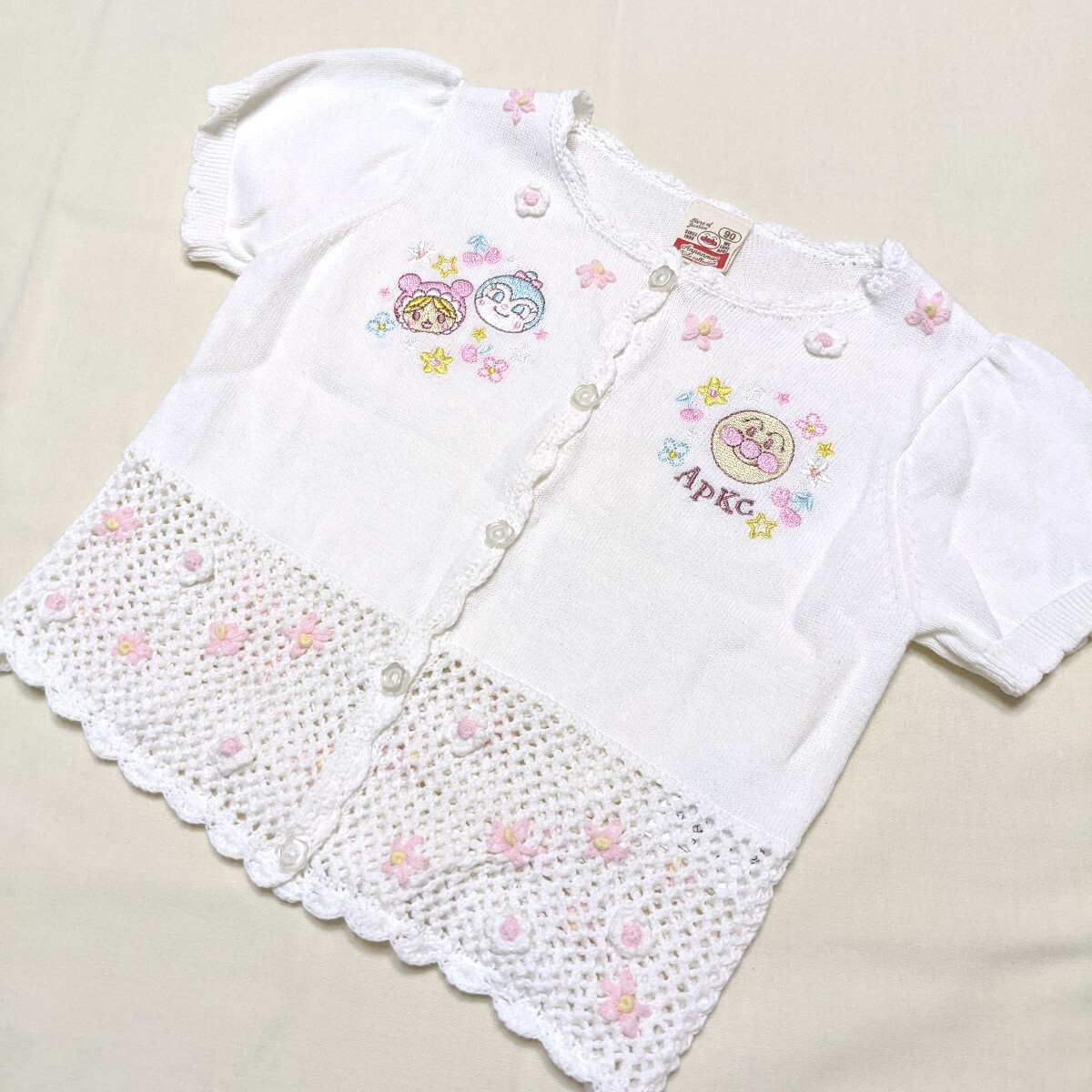 人気のアンパンマンがデザインの、半袖のニットのカーディガンです。