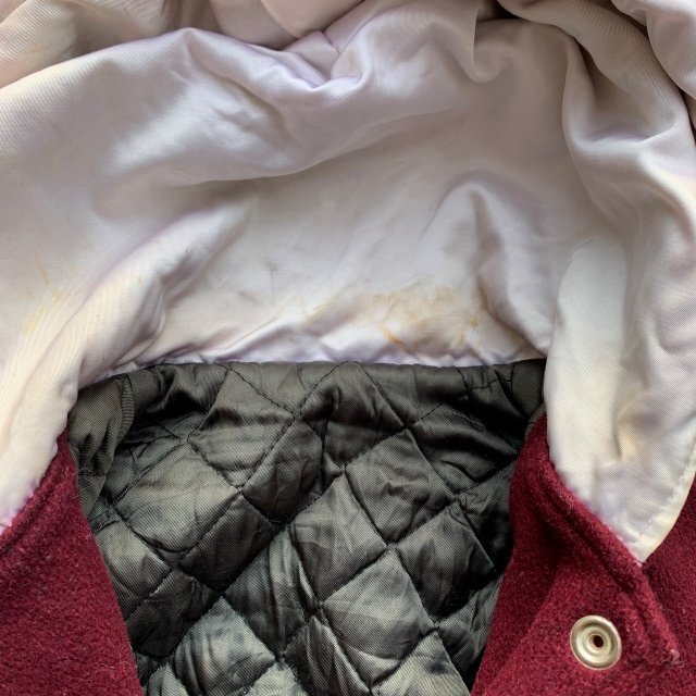 ★商品状態★ ・着用感があり、内装の首周り白地部分に画像のようにシミ汚れがございます。 ・ボタン合わせ右上のレディースものになります。 ・古着慣れされている方でしたら問題なく着用していただける程度かと思います。 ★素材★ ウール ★配色★ えんじ色が近いかと思います。 ★サイズ表記★ 不明 レディースサイズ ・実寸を参考にして下さい。 ★実寸サイズ★ 肩幅44㎝ 身幅53㎝(脇下~脇下) 着丈58㎝(襟下~裾) 袖丈56㎝(肩~袖先) ・平置きにての採寸となります。 ・若干の誤差はご了承ください。 | ||||