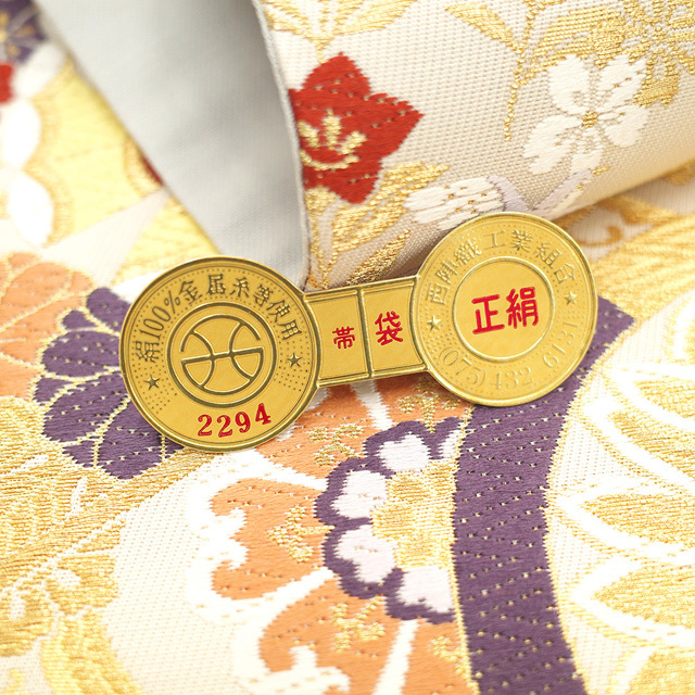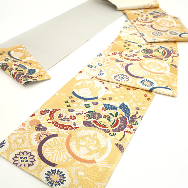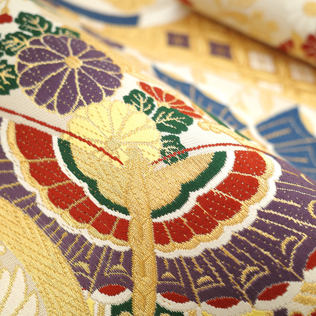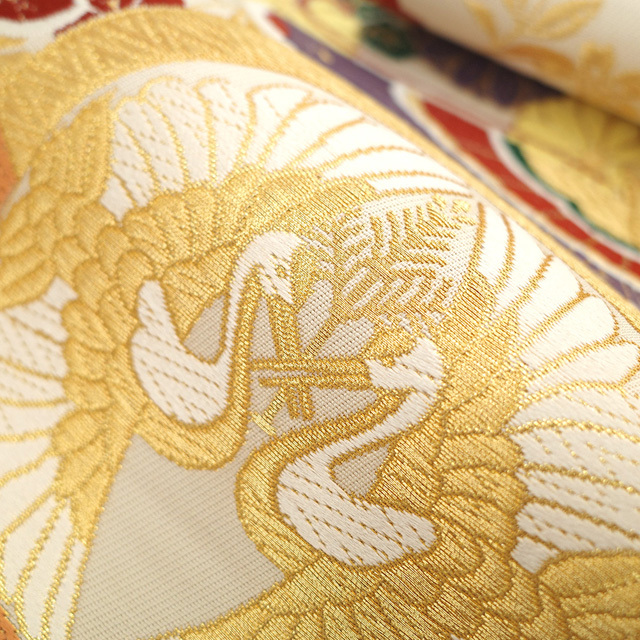 そこに、金糸や多彩なお色合いで 調や向かい鶴・桐・桜・菊・七宝 などが、丁寧に織り出されています。