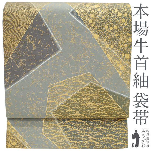 【中古】 袋帯 本場牛首紬 白山工房 石川県指定無形文化財 正絹 金彩加工 グレー 絞り 色紙重ね文 カジュアル 春 秋 冬 仕立て上がり みやがわ sb53565
