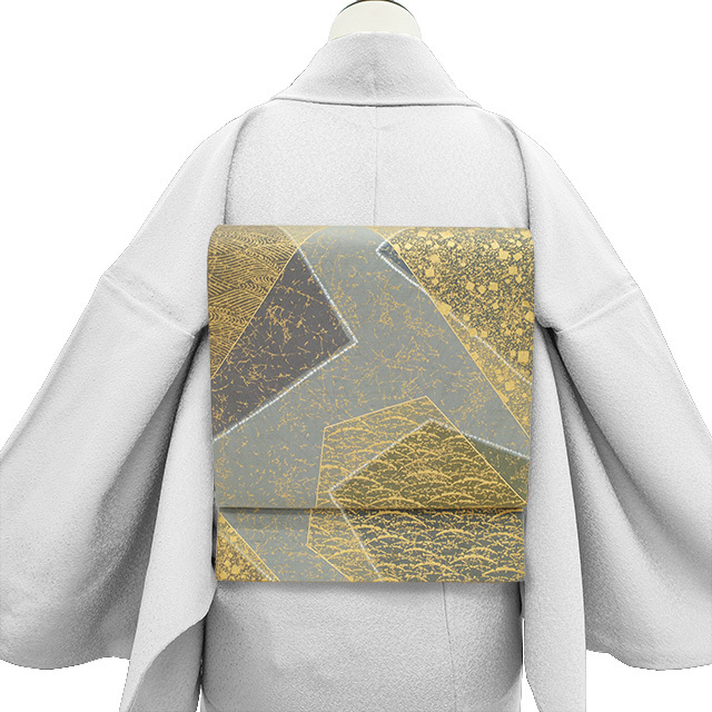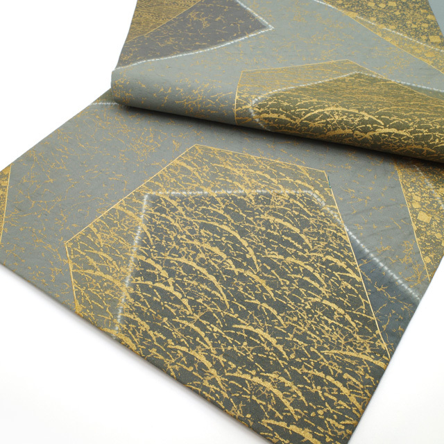 袋帯 石川県指定無形文化財 本場牛首紬 白山工房 金彩加工 正絹 グレー 絞り 色紙重ね文 カジュアル 中古 仕立て上がり みやがわ sb53565