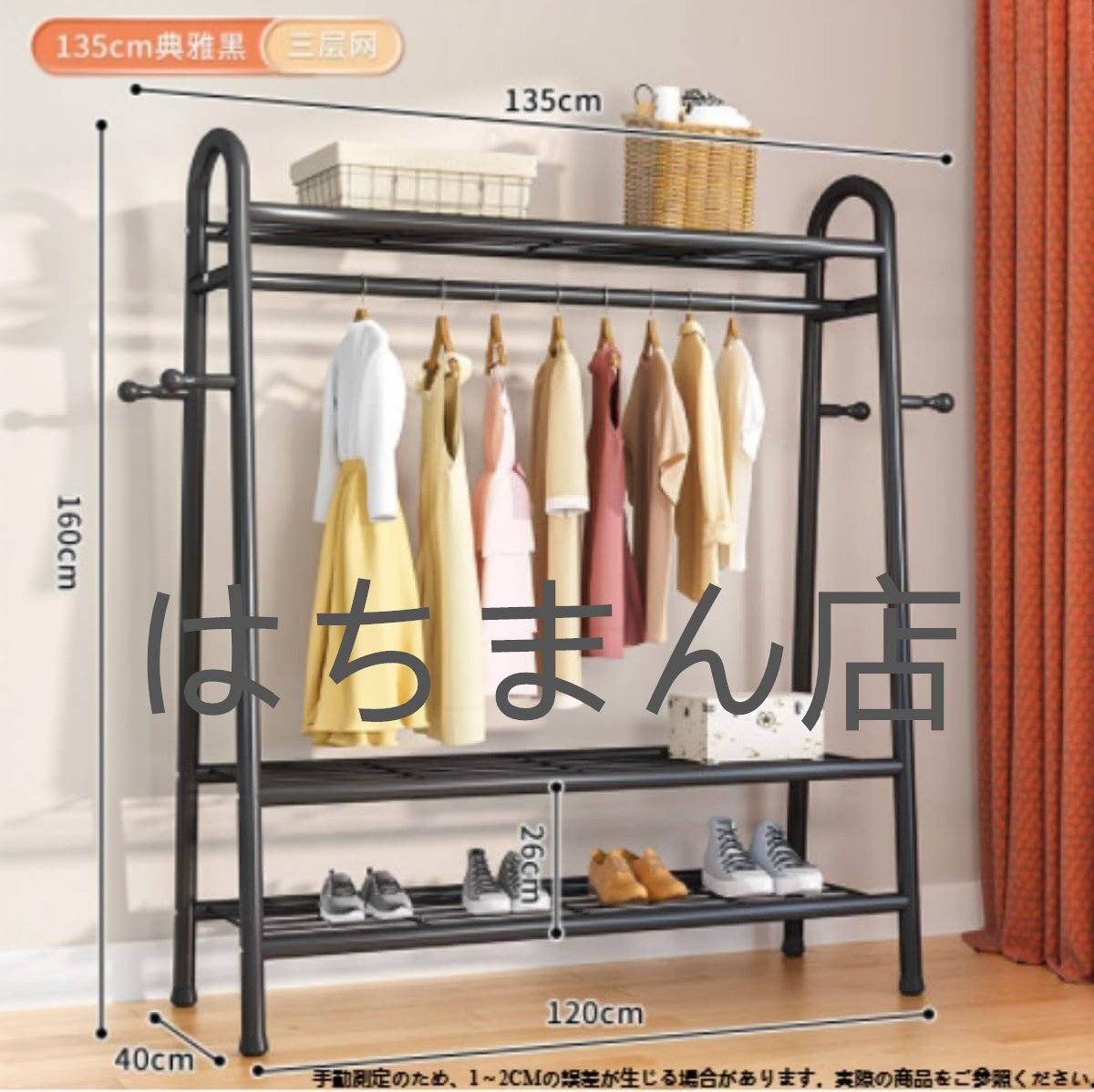 ハンガーラック パイプハンガーラック 頑丈 洋服ラック 金を太くします 多機能 大容量 ベランダハンガー 衣類収納ラック (黒です,135cm)