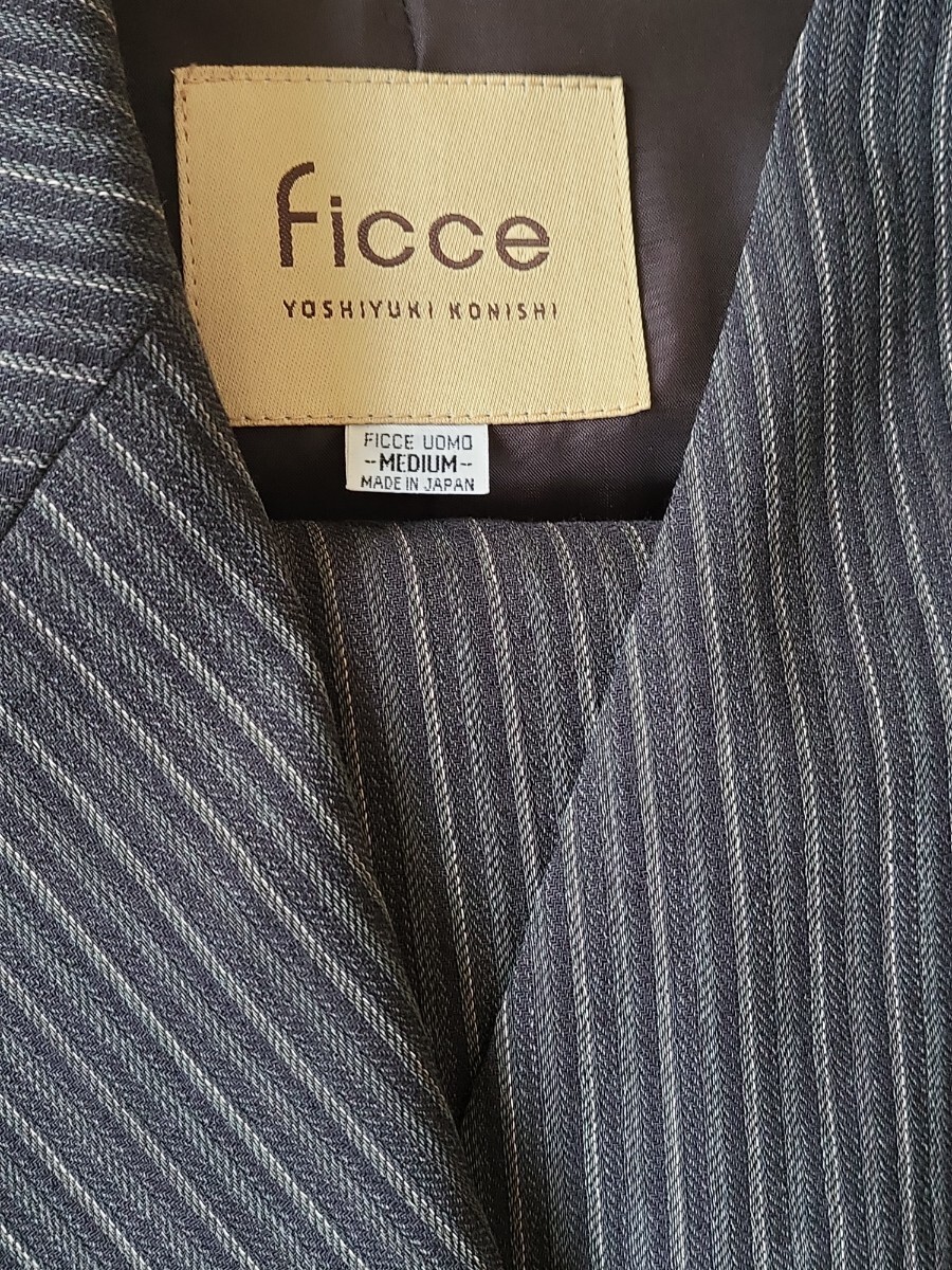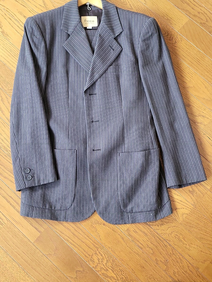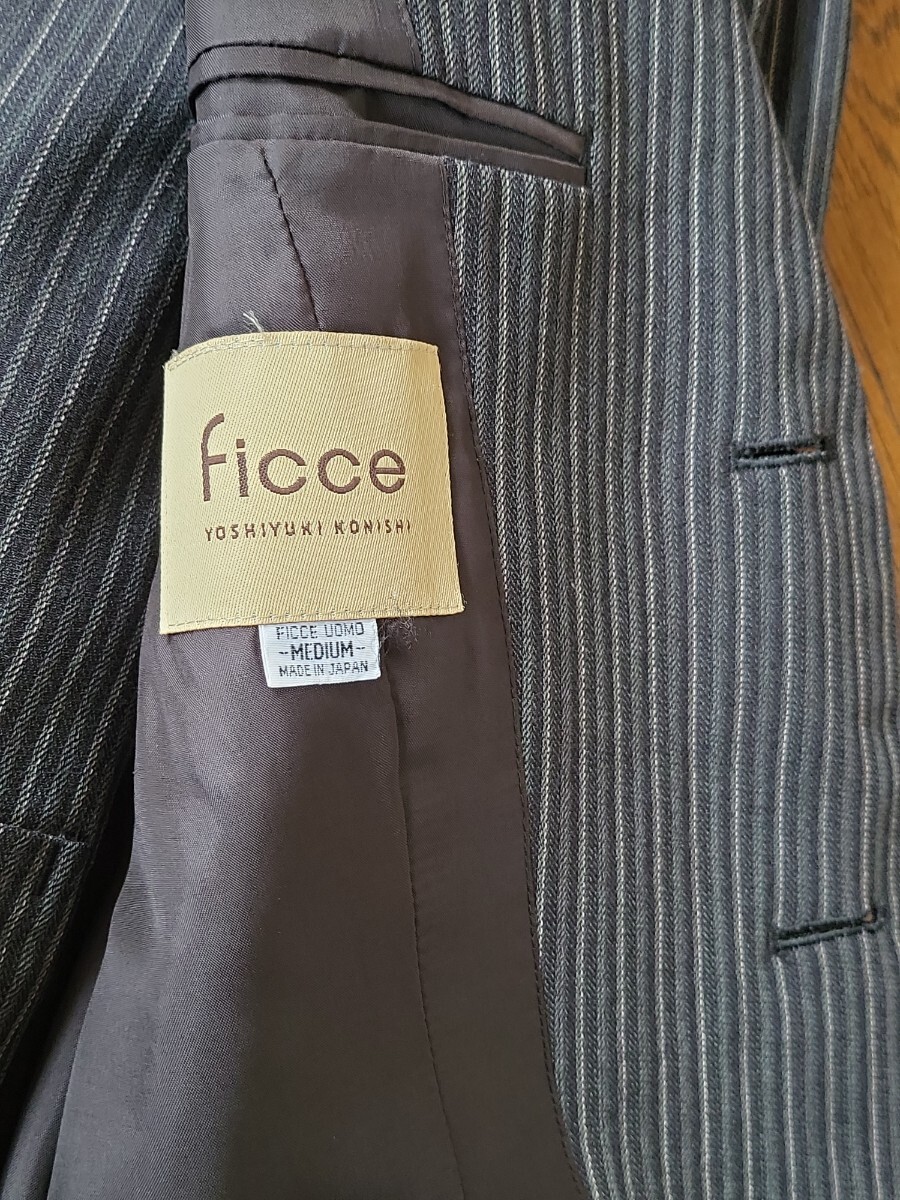 日本製のficceスーツは、デザインと機能性を兼ね備えています。ストライプ柄が特徴で、ビジネスシーンに最適です。