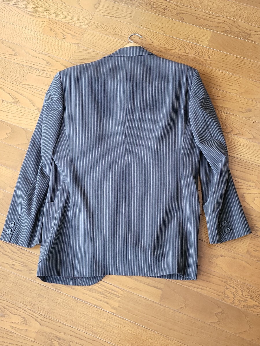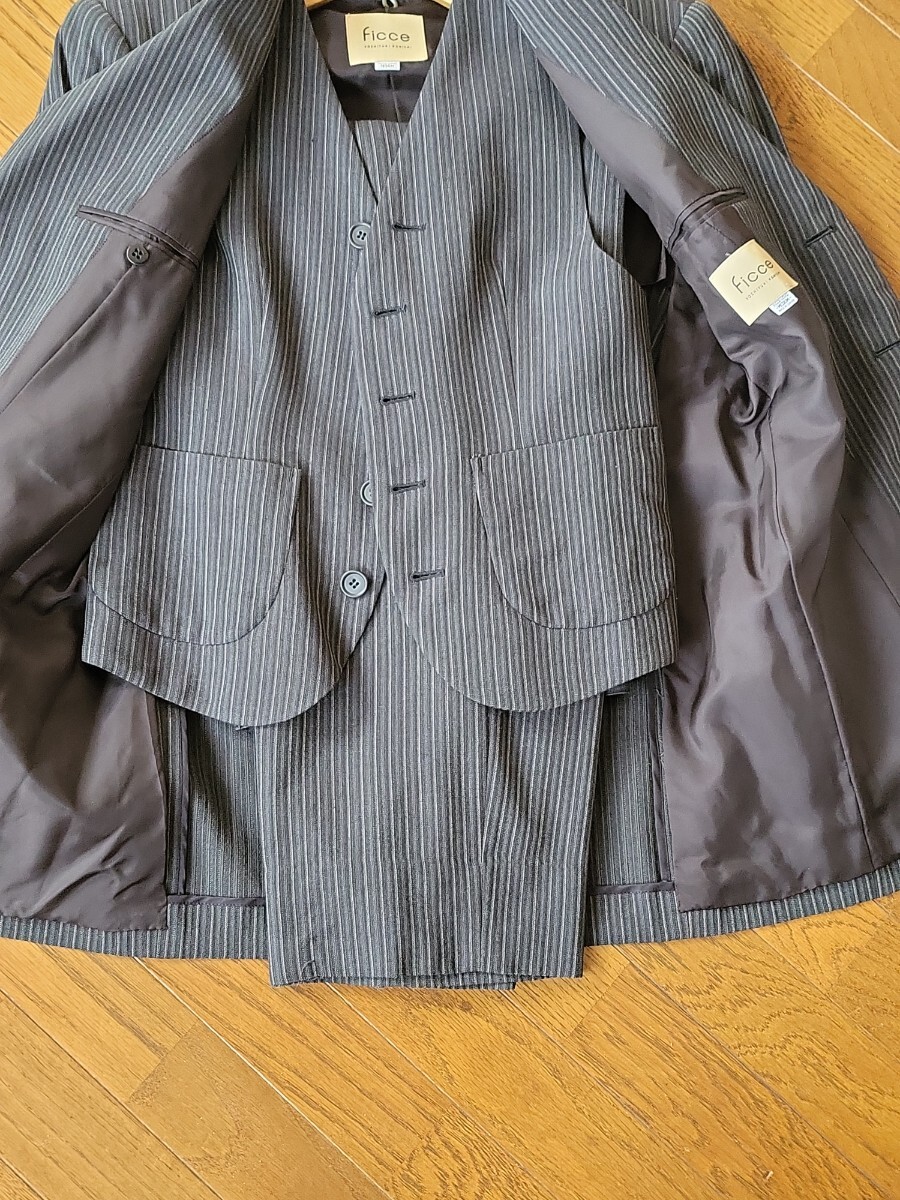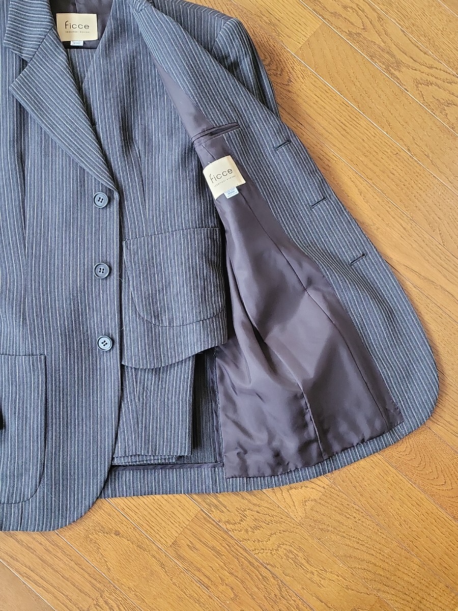 日本製のficceスーツは、デザインと機能性を兼ね備えています。ストライプ柄が特徴で、ビジネスシーンに最適です。