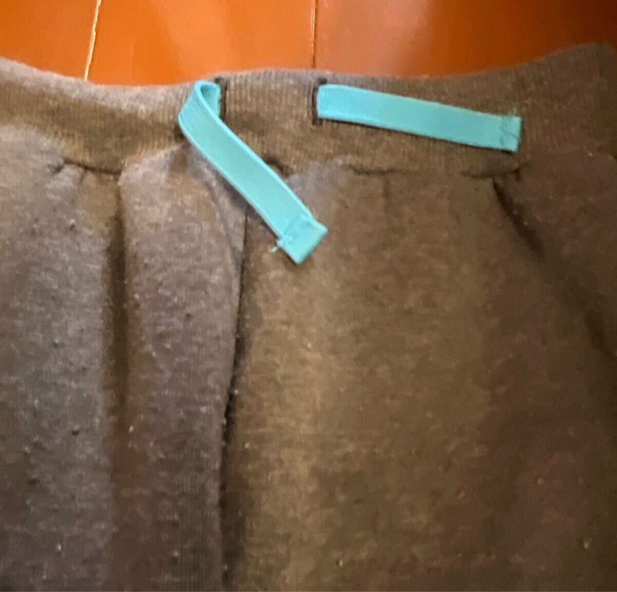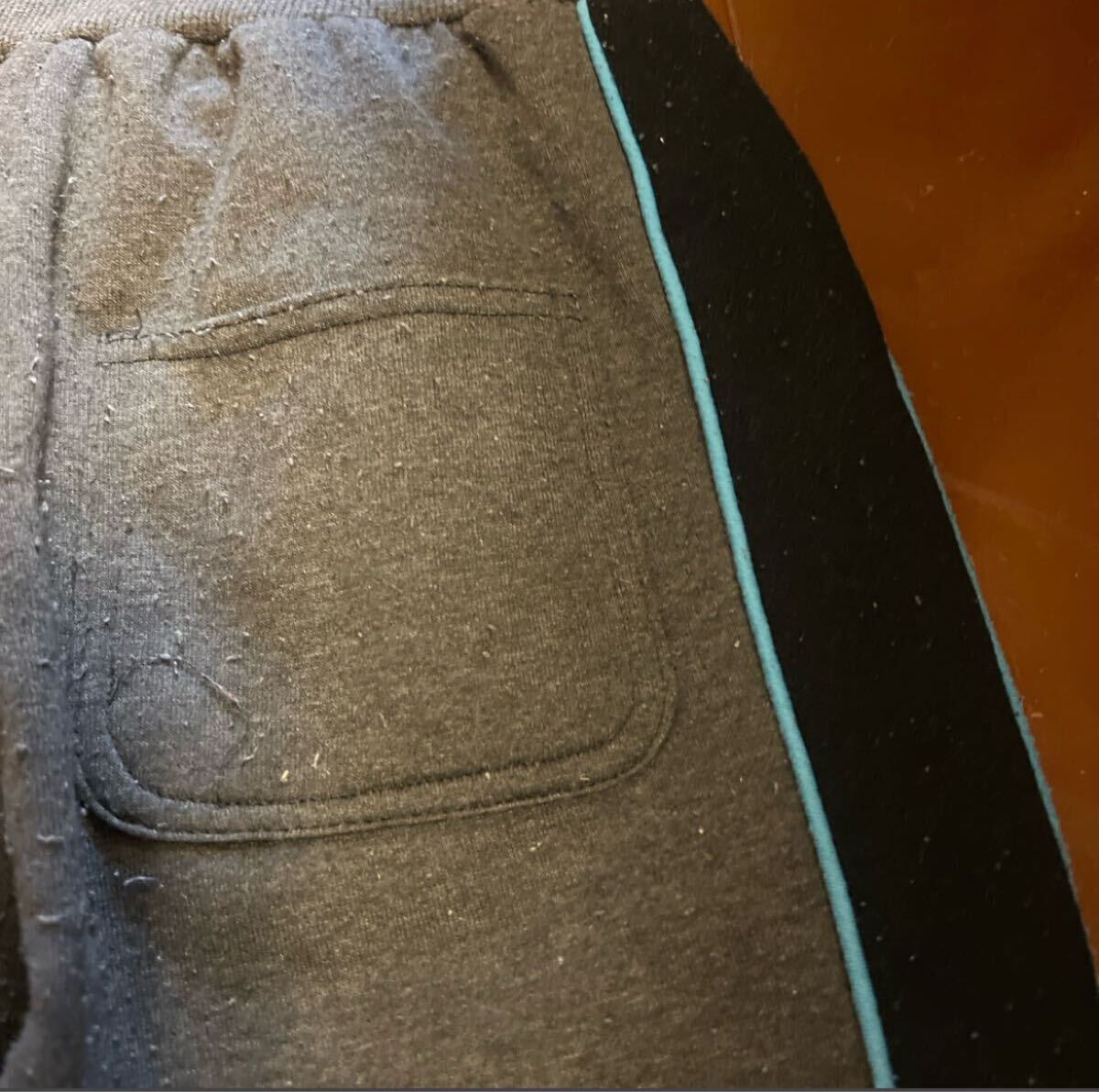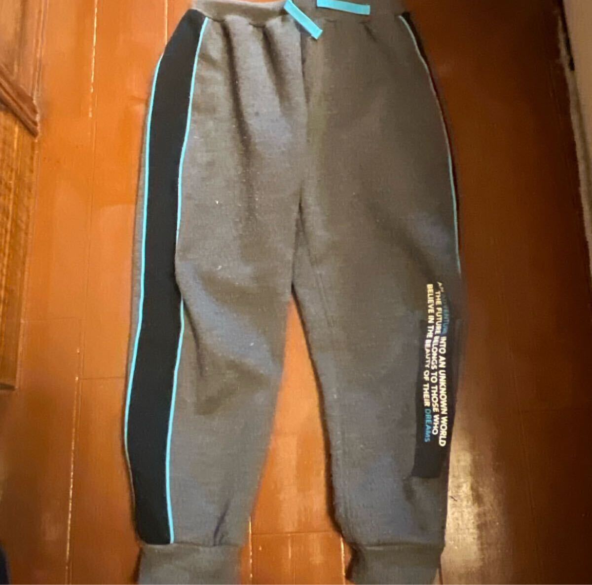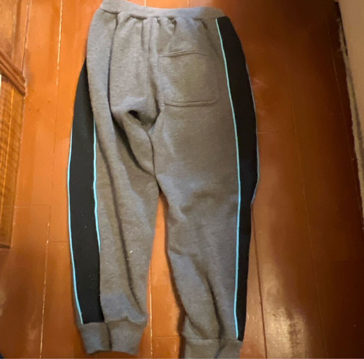 青いラインが特徴のグレーのスウェットパンツ。