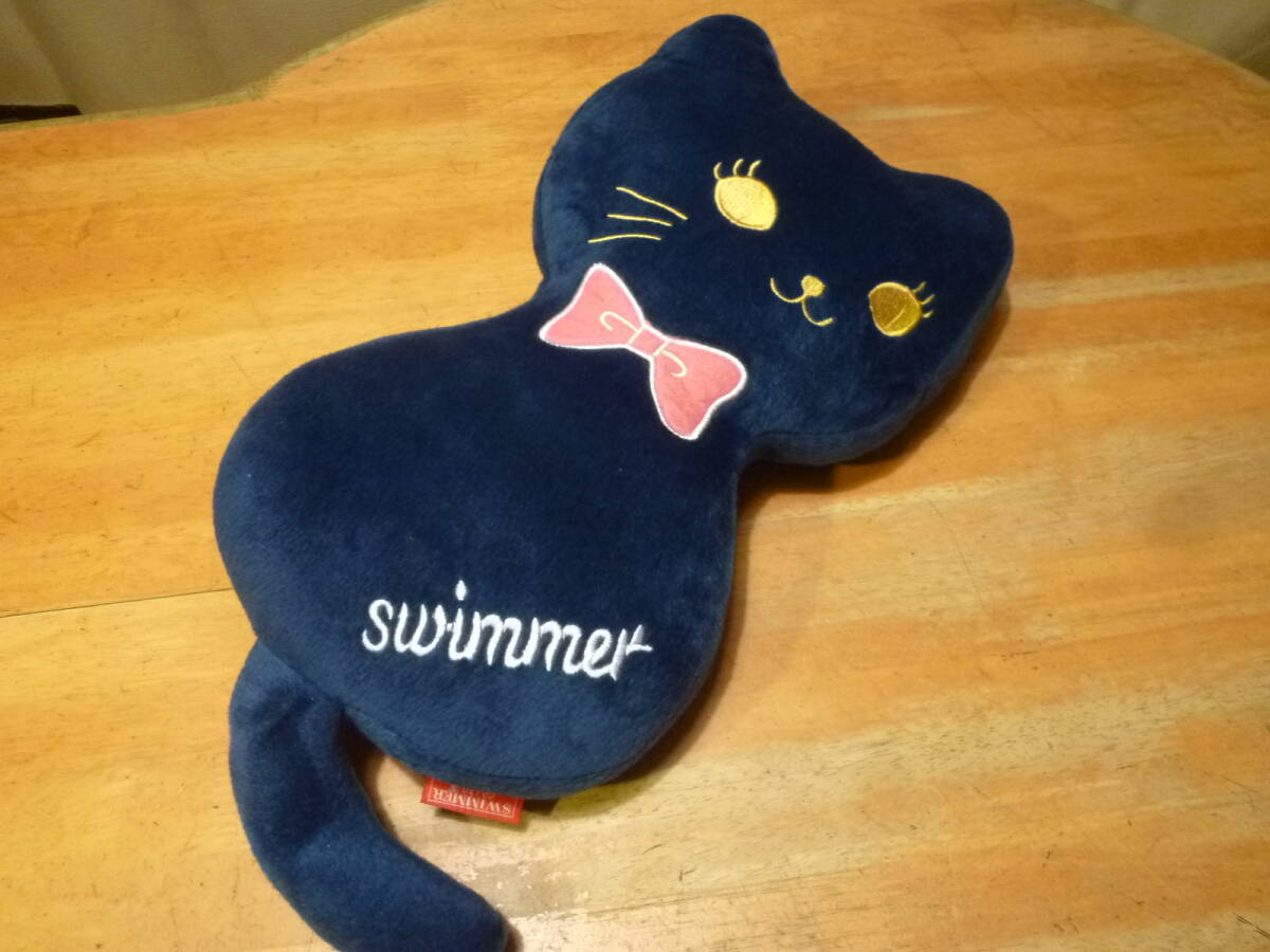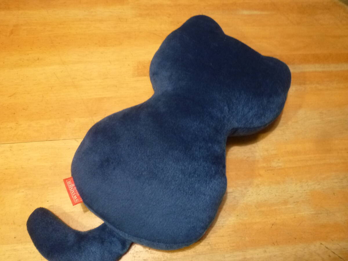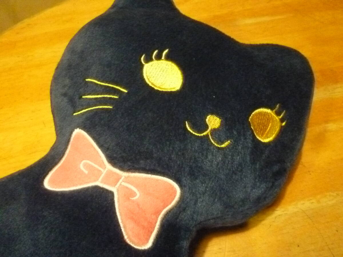 こちらはブルー地に金目とピンクの蝶ネクタイがオシャレなネコのクッションの様ですがはっきりせず、目と鼻やネクタイのフチ取りとロゴは刺繍の様です。