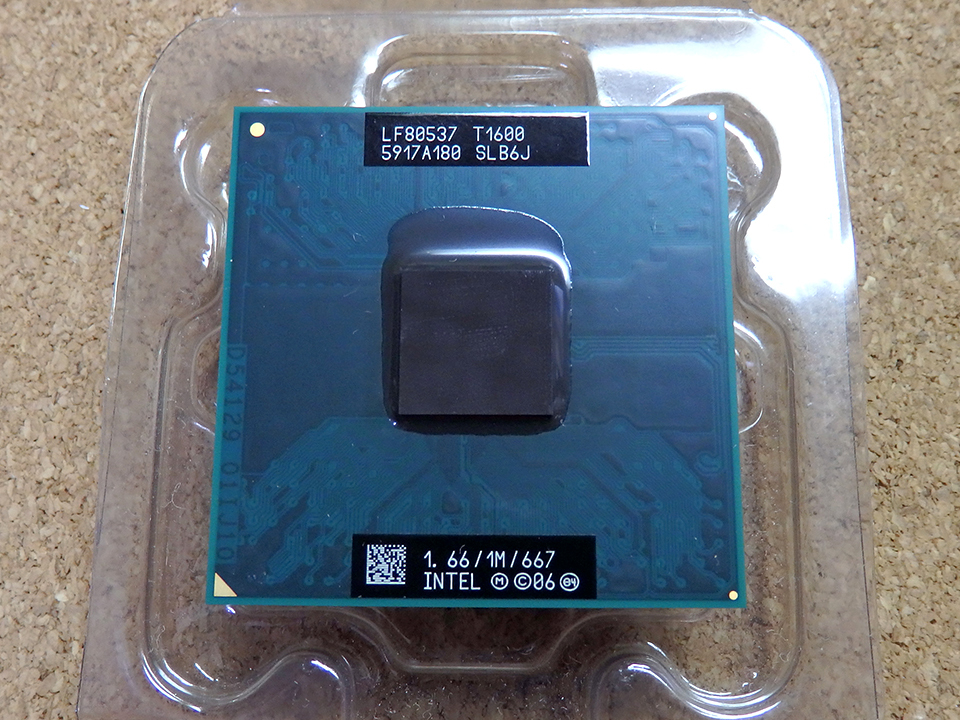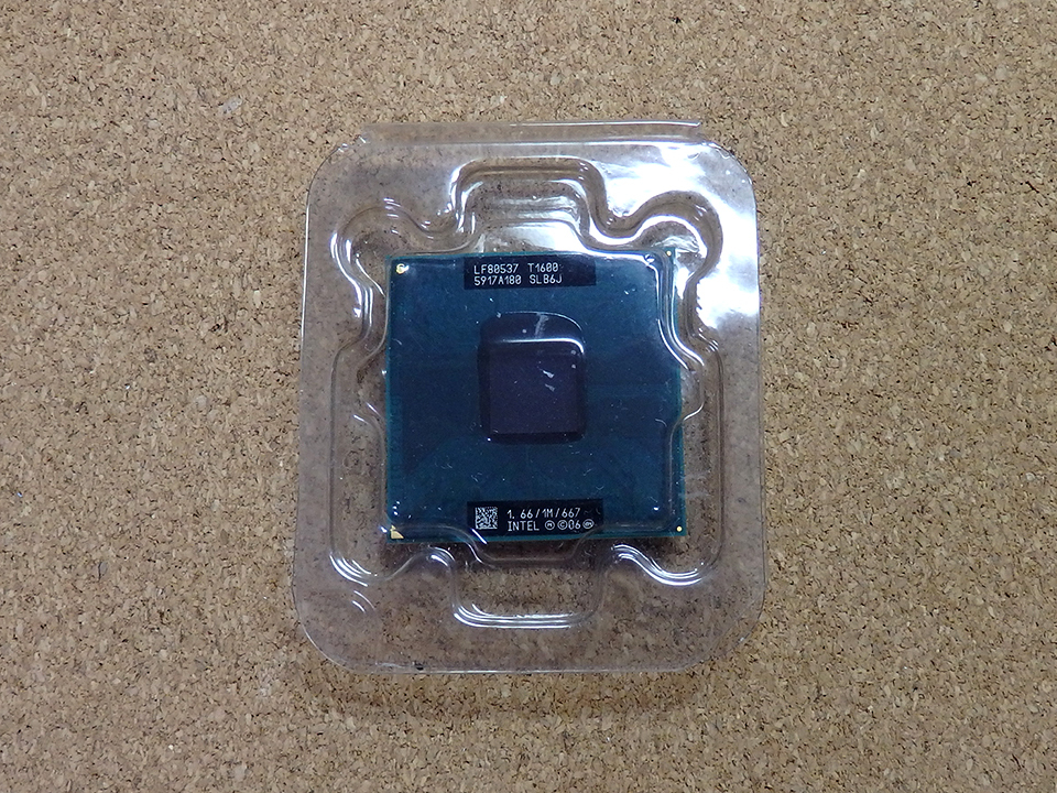 Intel Core 2 Duo T1600 1.66GHzです。動作PCからの取り外し品を長期保管していた物となりますが、現在動作確認できる環境が無いため出品にあたって改めての動作チェックは行っておりません。目視確認した限り物理的な破損などは無さそうですが、動作未チェック品ということをご理解ください。返品・返金は受け付けておりません。