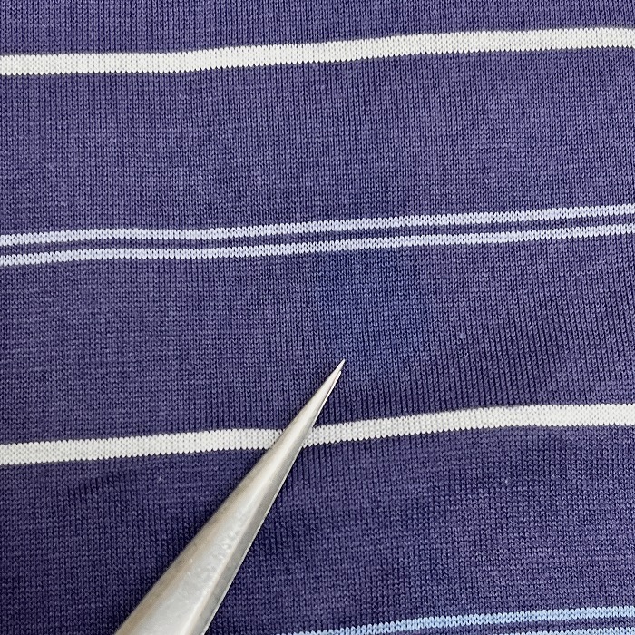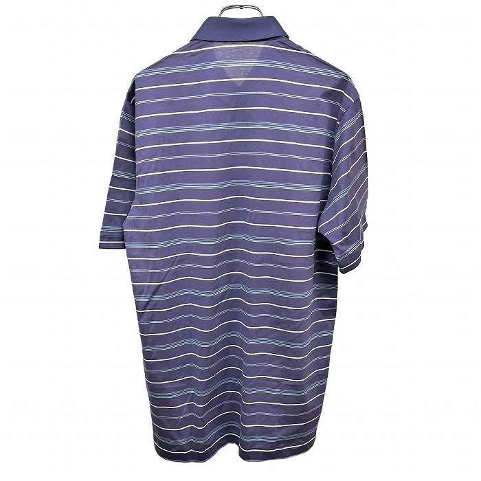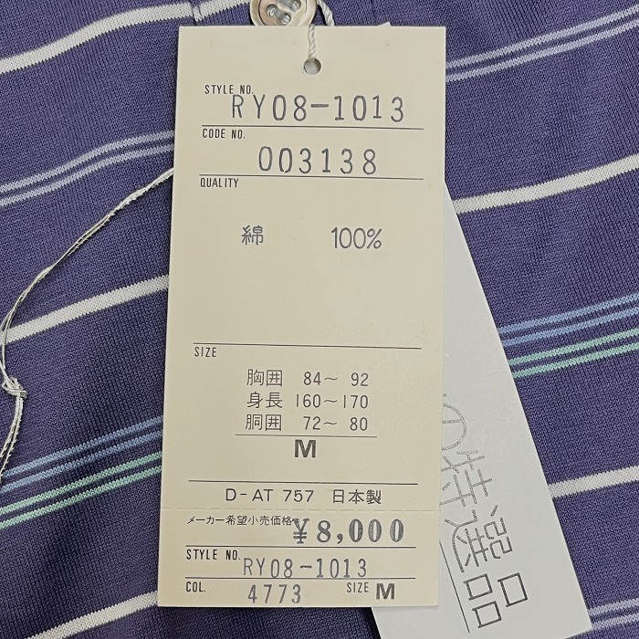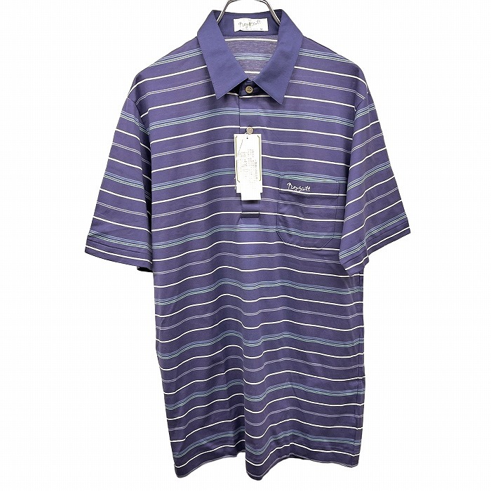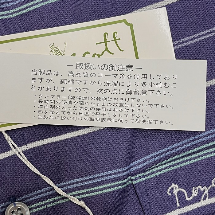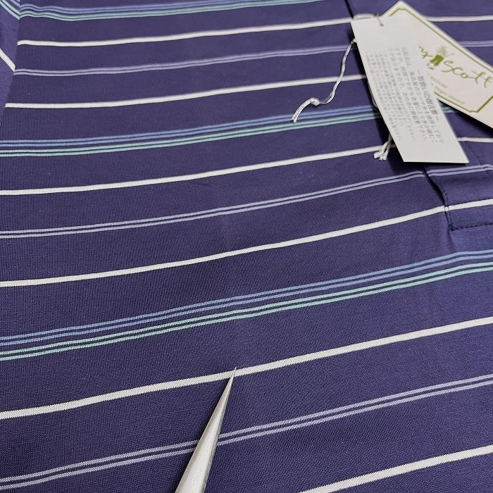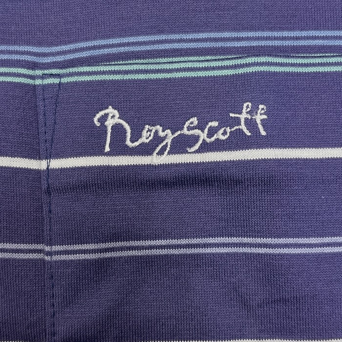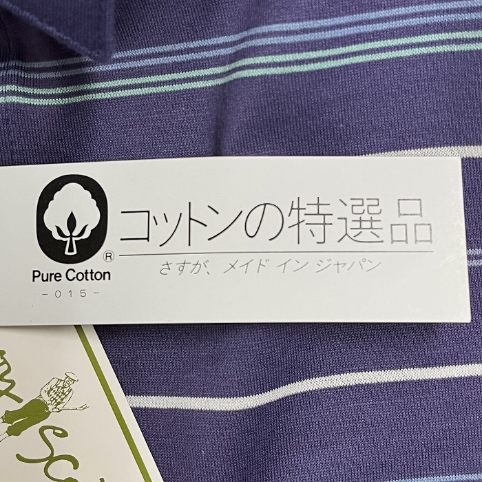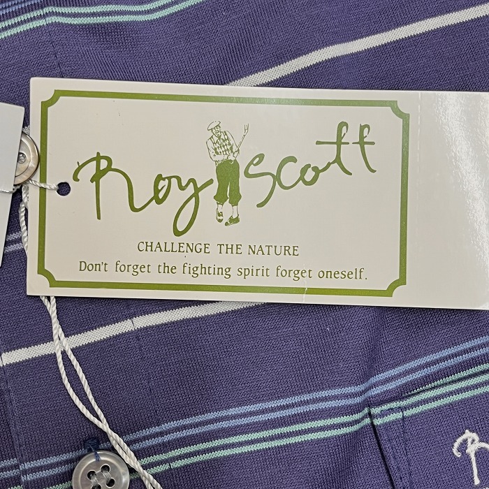 | 商品タイトル | 【新品/訳アリ】Roy Scott ポロシャツ Tシャツ生地 ボーダー 半袖 胸ポケット 刺繍 日本製 綿100% M パープル 青紫×紺×緑×白 メンズ |