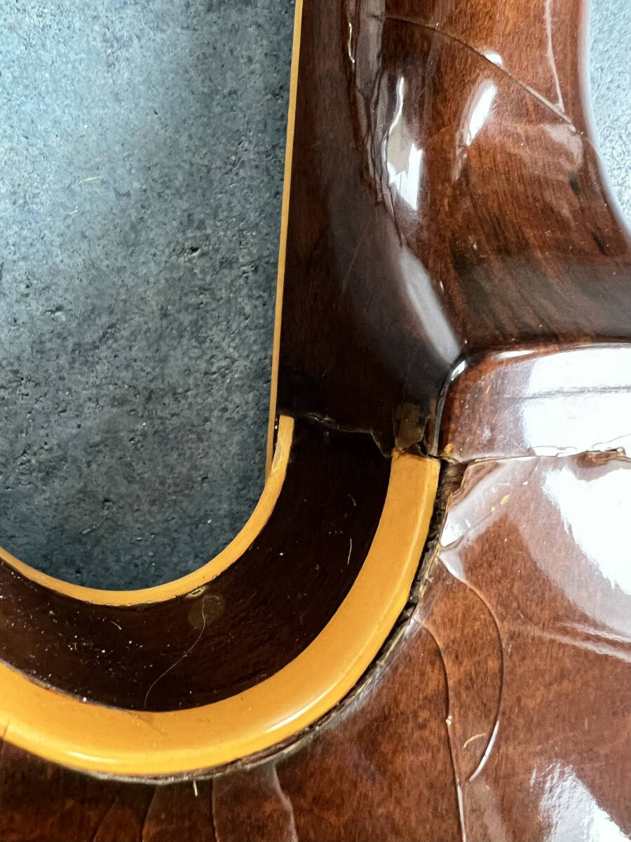 ピックガードは欠損していますが、指板はインレイがダブルパラレログラムで高級感溢れる魅力的なルックスです。
