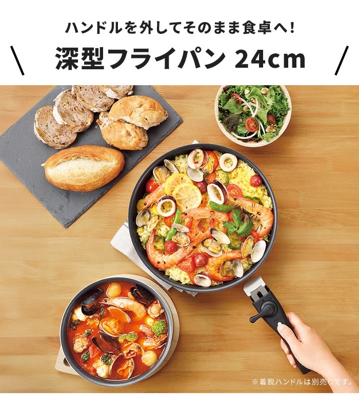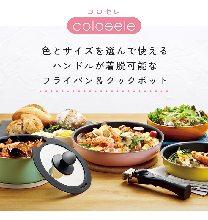 | 【colosele|コロセレ】 ハンドルを外して、料理をそのまま食卓へ。 色とサイズを選んで使える、ハンドルの外せるフライパン&クックポットシリーズ。 こちらは深型フライパン24cm単品を販売しております。(※着脱式ハンドル、蓋は別売りです) ガス火やIH調理器はもちろん、オーブンにも使用できるので(200℃以下での使用を推奨)、料理の幅が広がります。(※電子レンジでは使用できません) シリーズで揃えれば、鮮やかな5種類のカラーリングでキッチンや食卓を華やかに演出します。 フライパンやクックポットはもちろん、ガラス蓋やハンドルも自由に選べるので、必要に応じて自分なりのセットが作れます。 買い足しや買い替えにも便利です。 シリーズで重ねてコンパクトにしまえるので、収納時も省スペース。 |