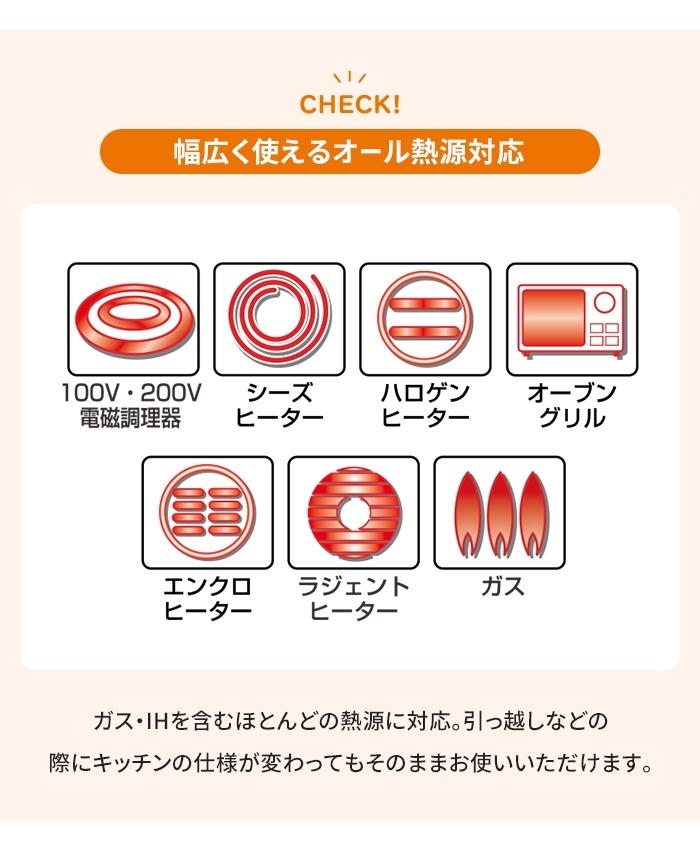 | 200V|オール熱源対応 ◎全ての熱源に対応しています。 (※電子レンジには使用できません) ・電磁調理器 ・ガスコンロ ・エンクロヒーター ・ラジェントヒーター ・ハロゲンヒーター ・シーズヒーター |