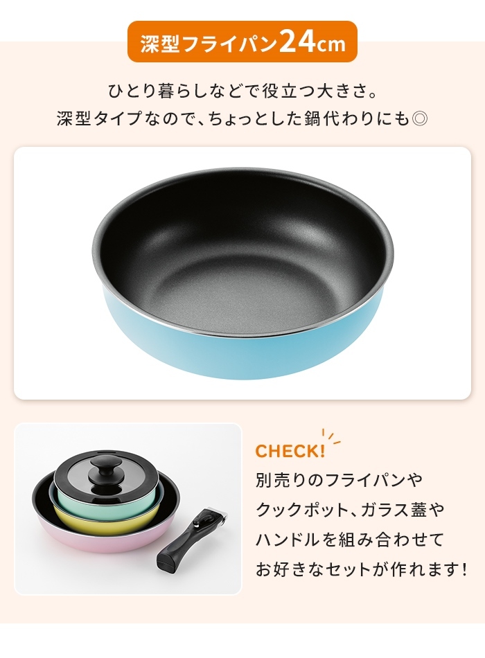 | フライパン 24cm 単品 取っ手着脱可能 ハンドル別売 オール熱源対応 セット品 内面ふっ素樹脂塗膜加工 重ねて収納 ブルー 調理器具 調理鍋 着脱ハンドル対応 ガス火対応 IH対応 オーブン対応 キッチン用品 保存容器 お手入れ簡単 便利 可愛い おしゃれ 調理 お弁当作り キッチン 台所 |