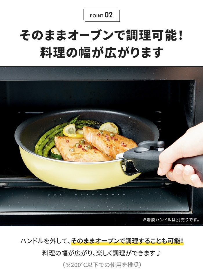 | ※着脱式ハンドル、蓋は別売りです。 ※電子レンジには使用できません。 ※オーブン使用:200℃以下での使用を推奨。 |