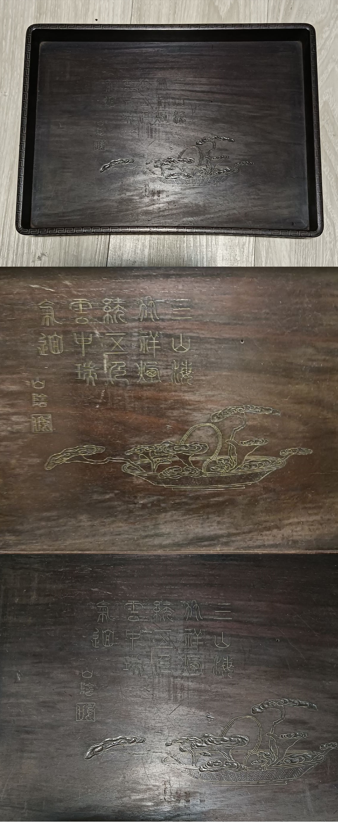 清代古作 唐木 一枚板 銀象嵌 霊芝 唐詩 紫檀 長方盆 中国古作