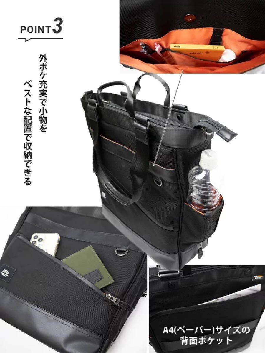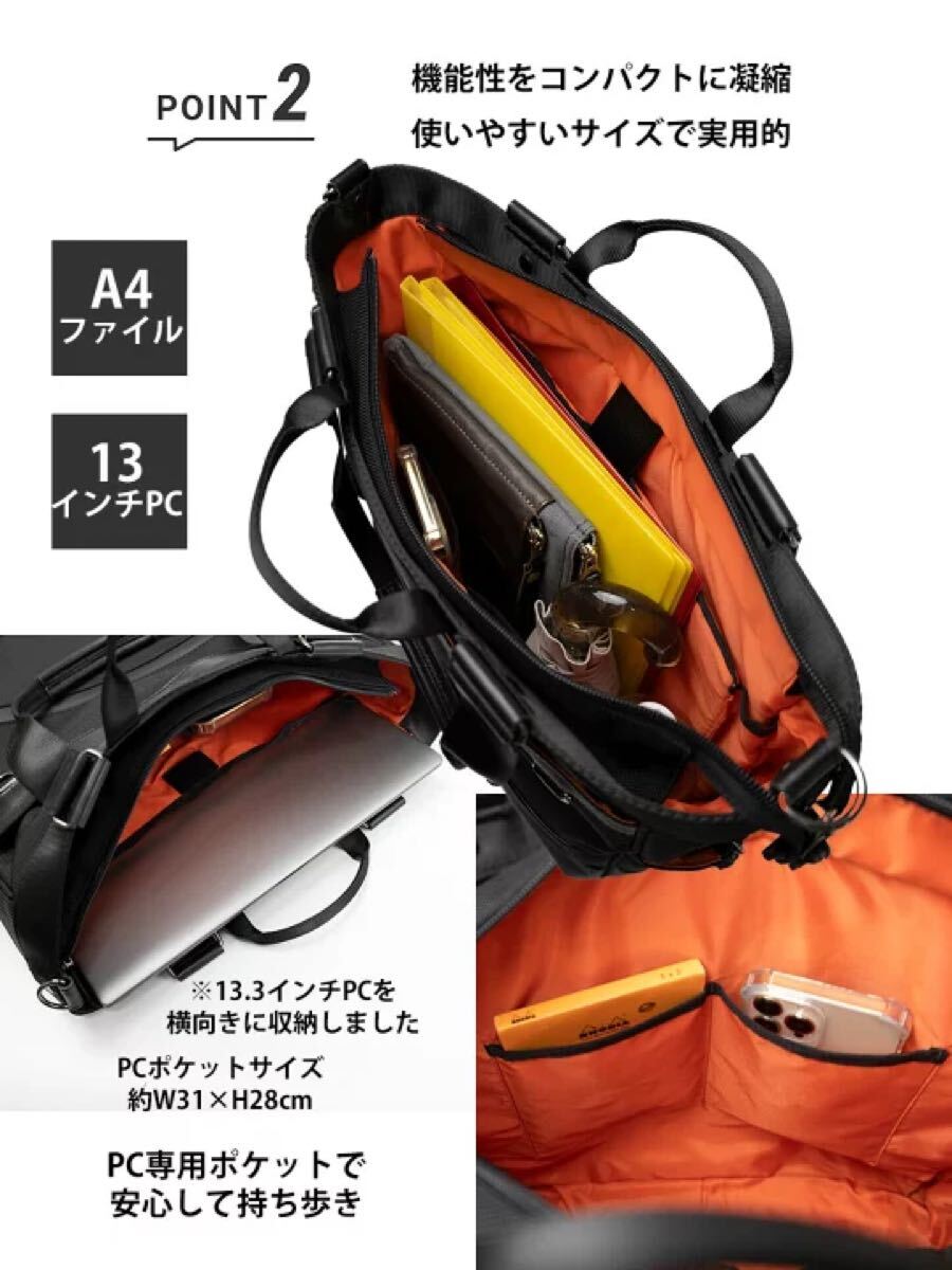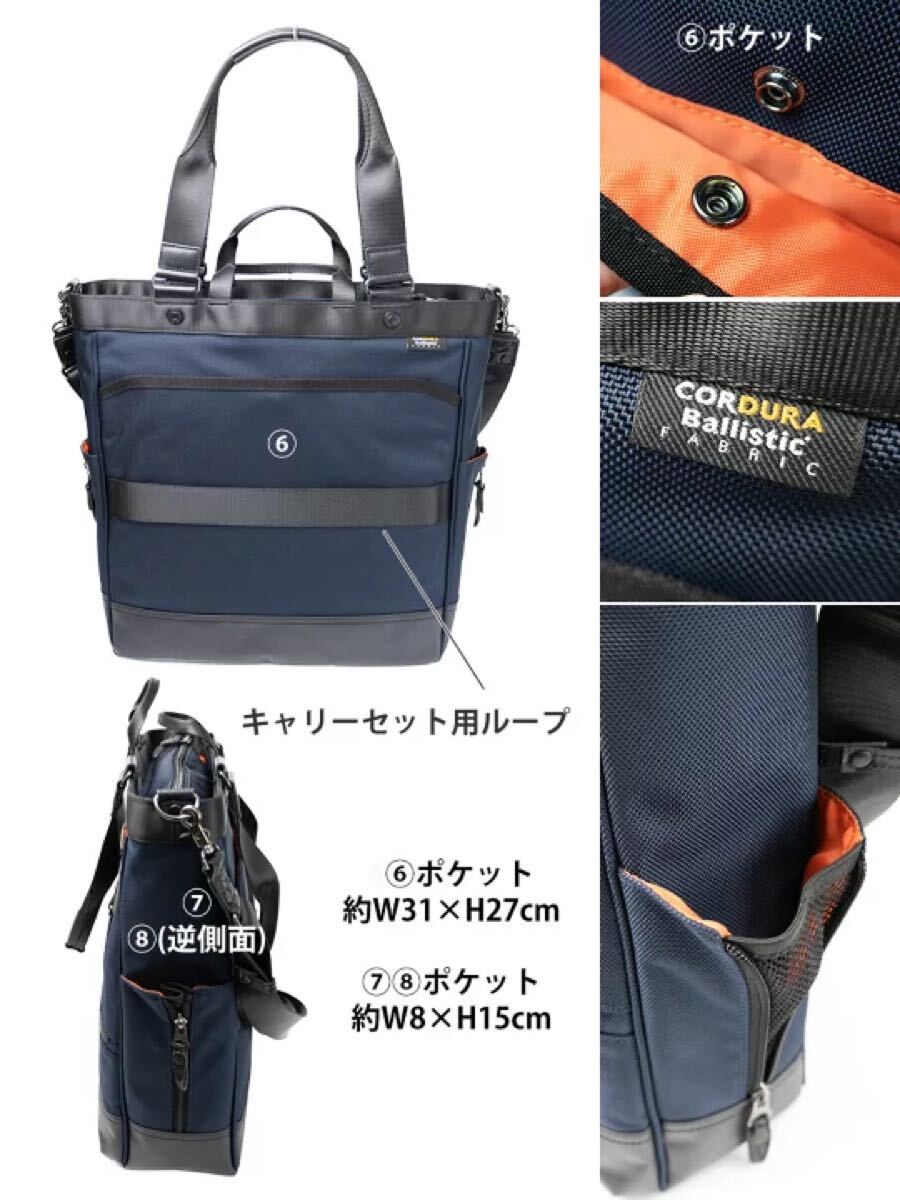 ●A4ファイル対応サイズの縦型。PCポケットは13インチサイズ。アウトポケットが充実しており使いやすい箇所に小物を収納することができます。キャリーバッグにセットアップ可能でビジネス出張にも便利です。