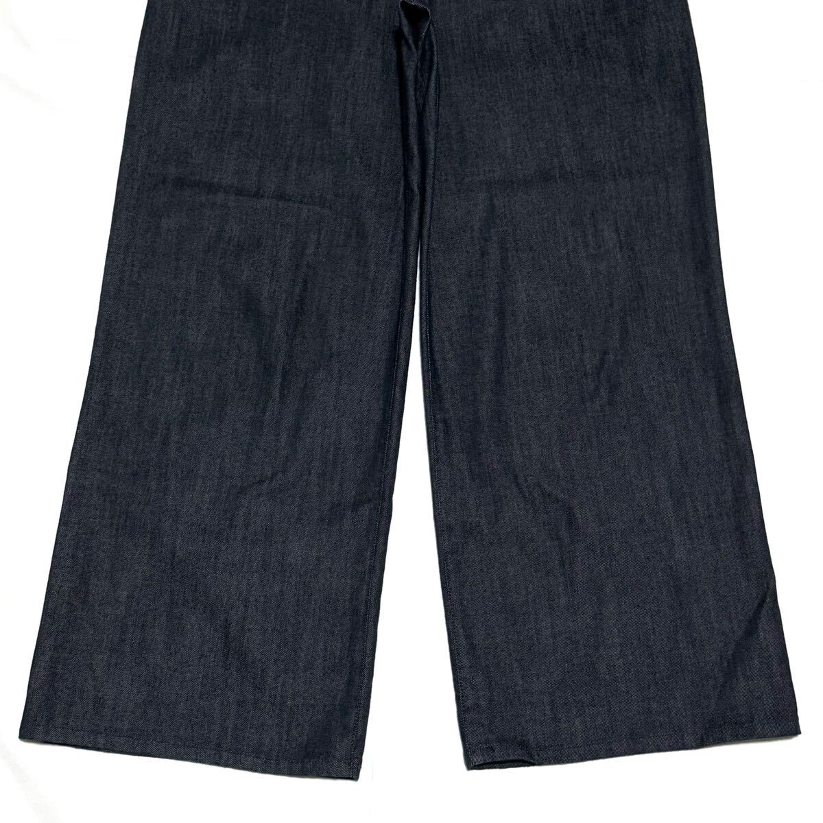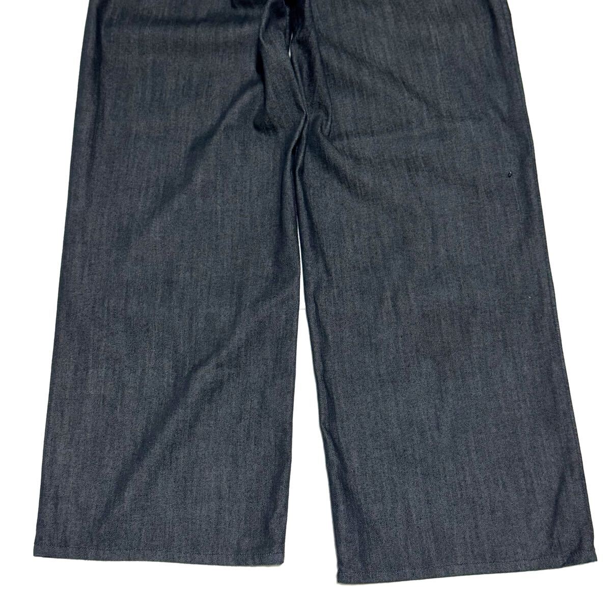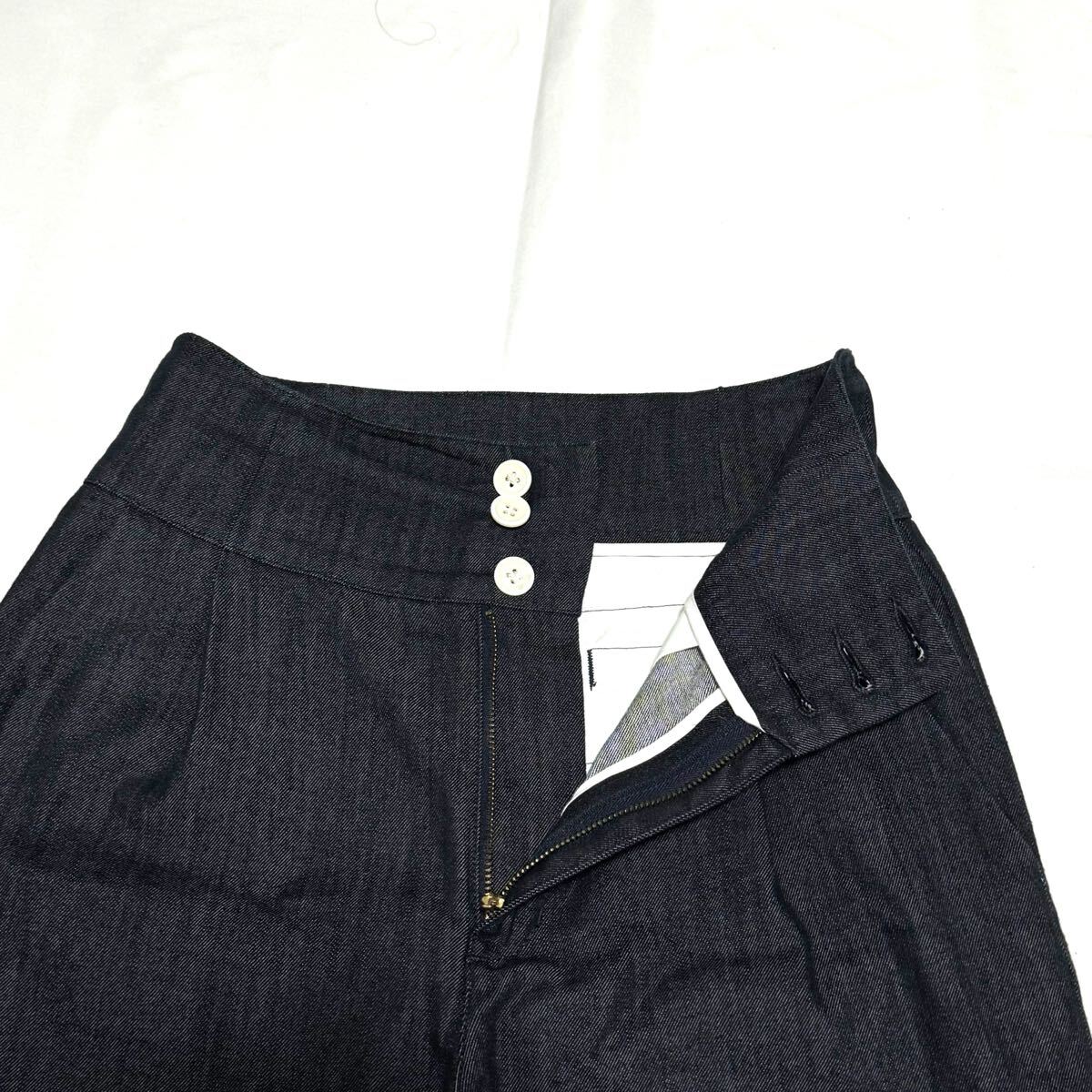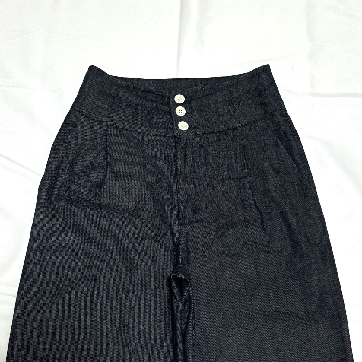 ダークデニムのワイドレッグパンツ、ボタン付きウエストデザイン。