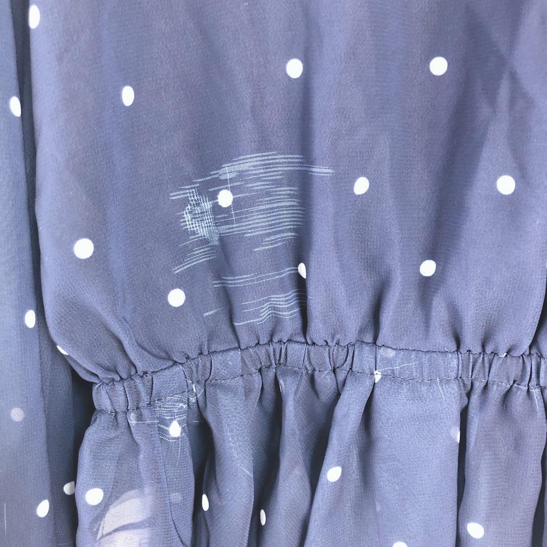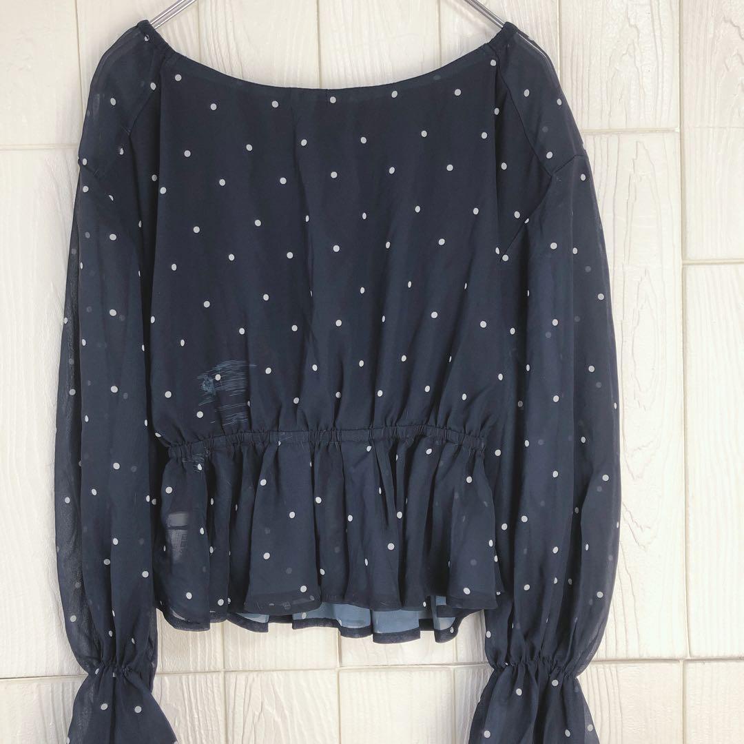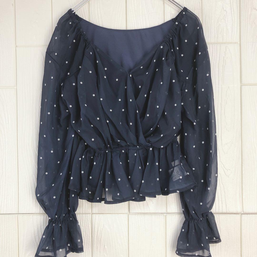 ネイビーのドット柄長袖ブラウス、柔らかな素材で着心地抜群。