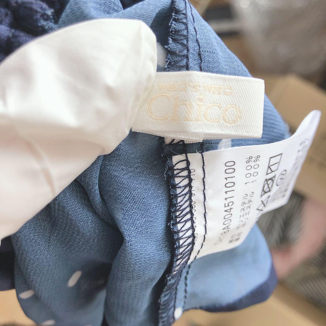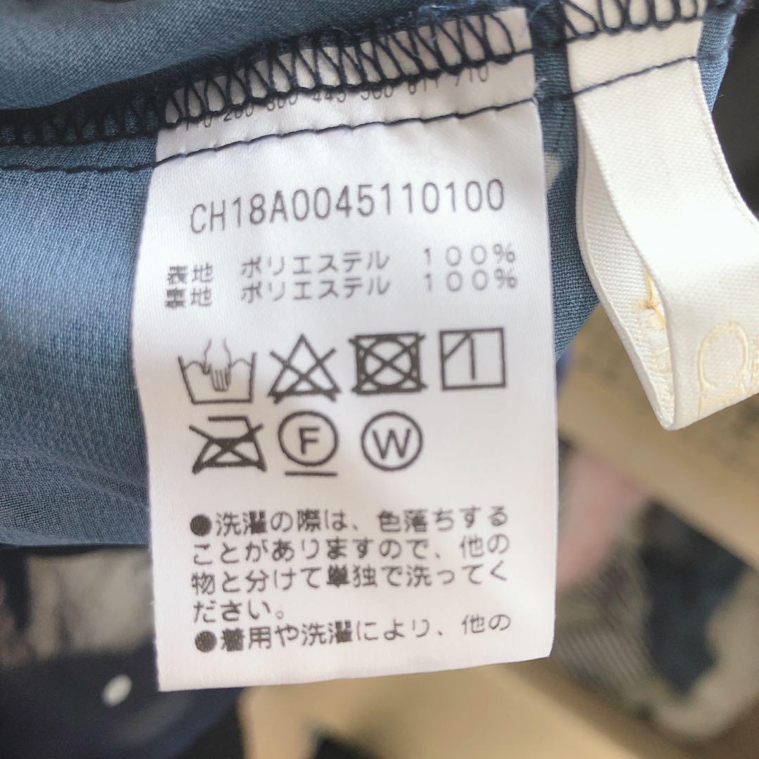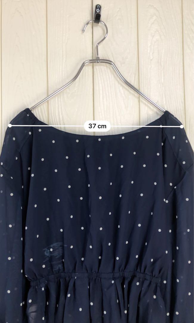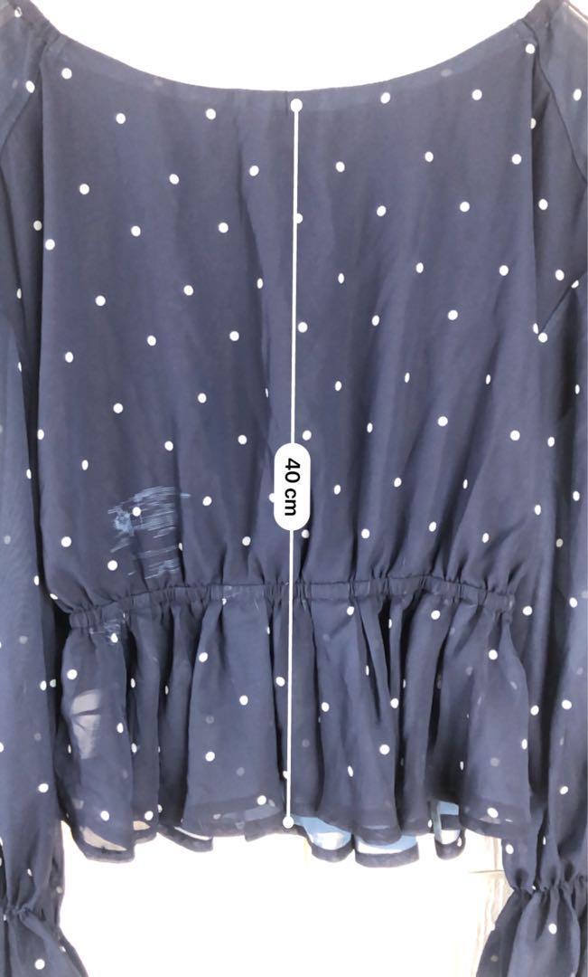 ネイビーのドット柄長袖ブラウス、柔らかな素材で着心地抜群。